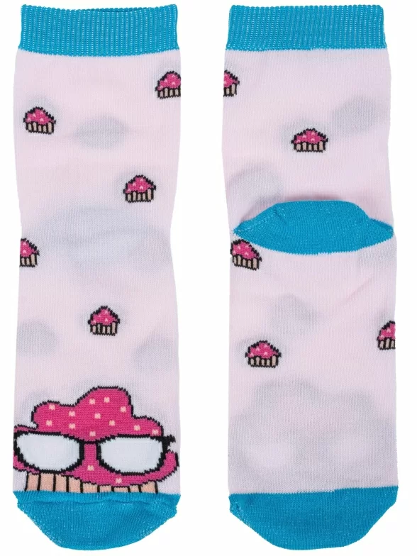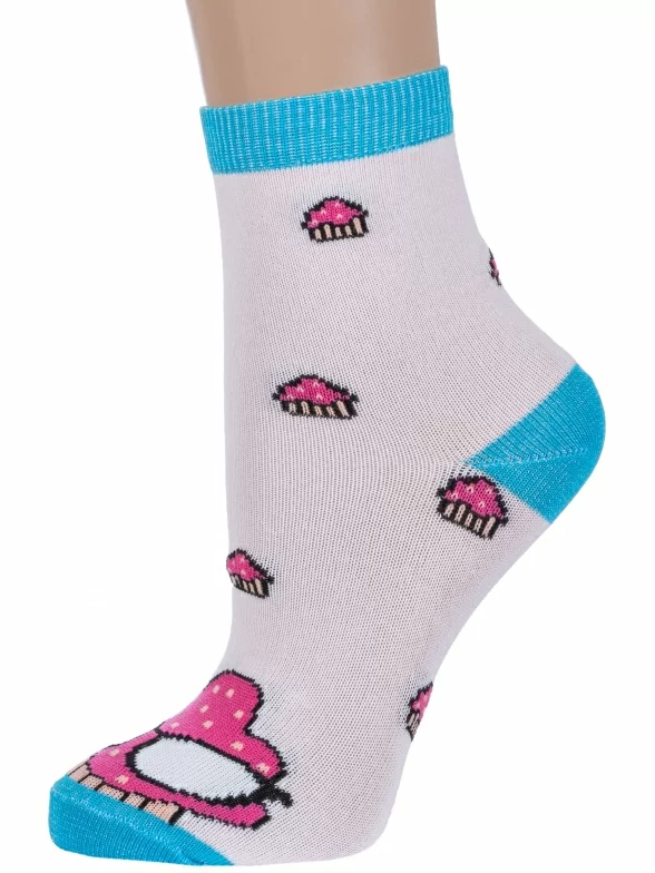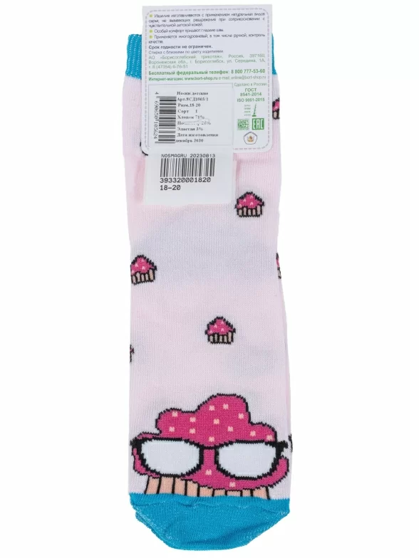 Круглогодичные укороченные детские носки, цвет розовый, повседневные, шов обычный (не бесшовные), принт (рисунок): контрастные пятка / мысок / резинка, еда и напитки, с узором, состав: 71% хлопок, 26% полиэстер, 3% эластан, арт. 8СД1003/1. Производитель «АО Борисоглебский трикотаж, Воронежская обл, Россия» под брендом «Борисоглебский трикотаж».