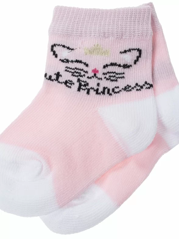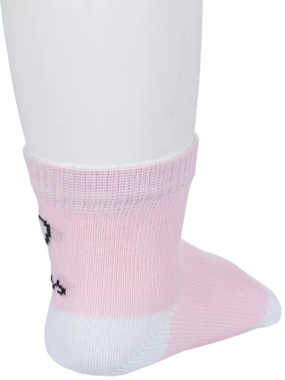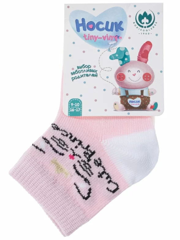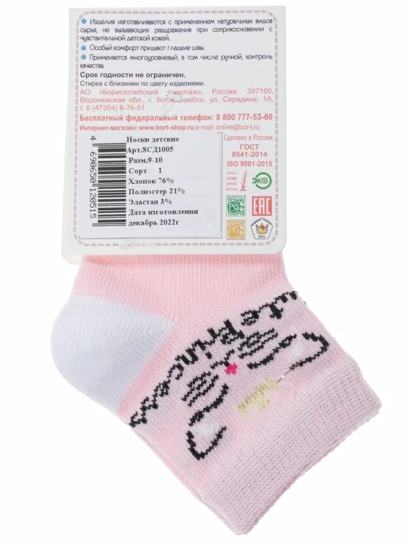 Круглогодичные укороченные детские носки, цвет розовый, повседневные, шов обычный (не бесшовные), принт (рисунок): надписи, контрастные пятка / мысок / резинка, животные, с узором, состав: 76% хлопок, 21% полиэстер, 3% эластан, арт. 8СД1005. Производитель «АО Борисоглебский трикотаж, Воронежская обл, Россия» под брендом «Борисоглебский трикотаж».