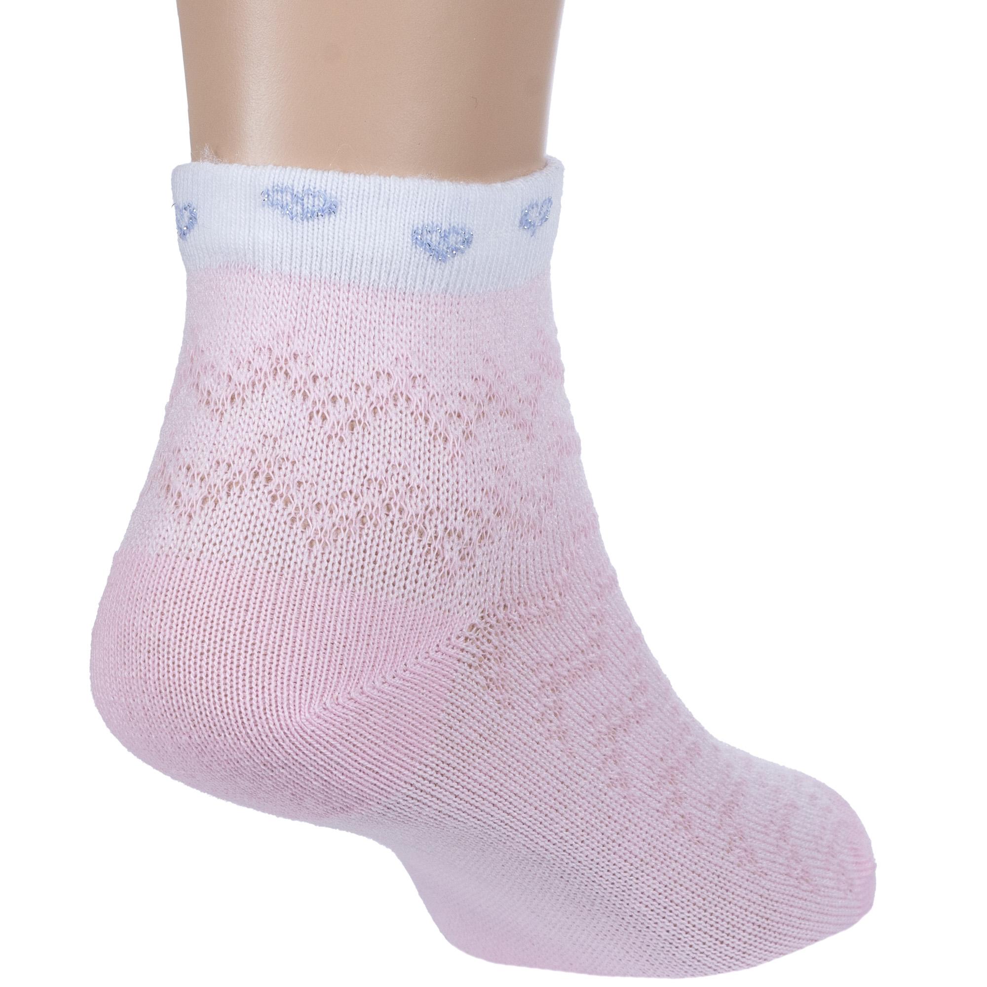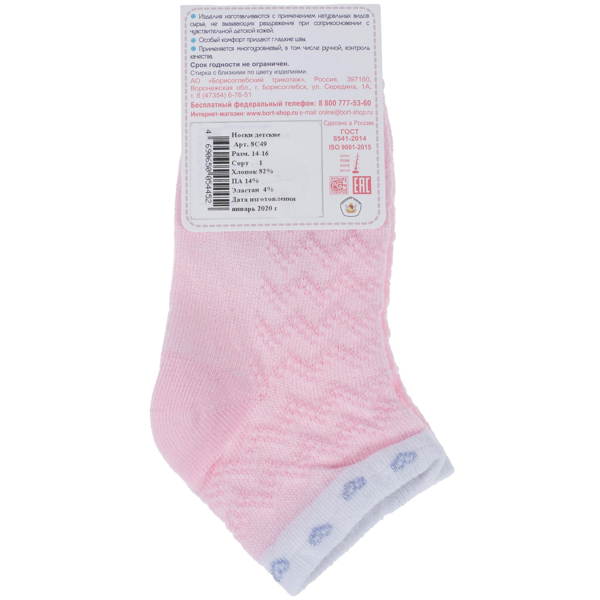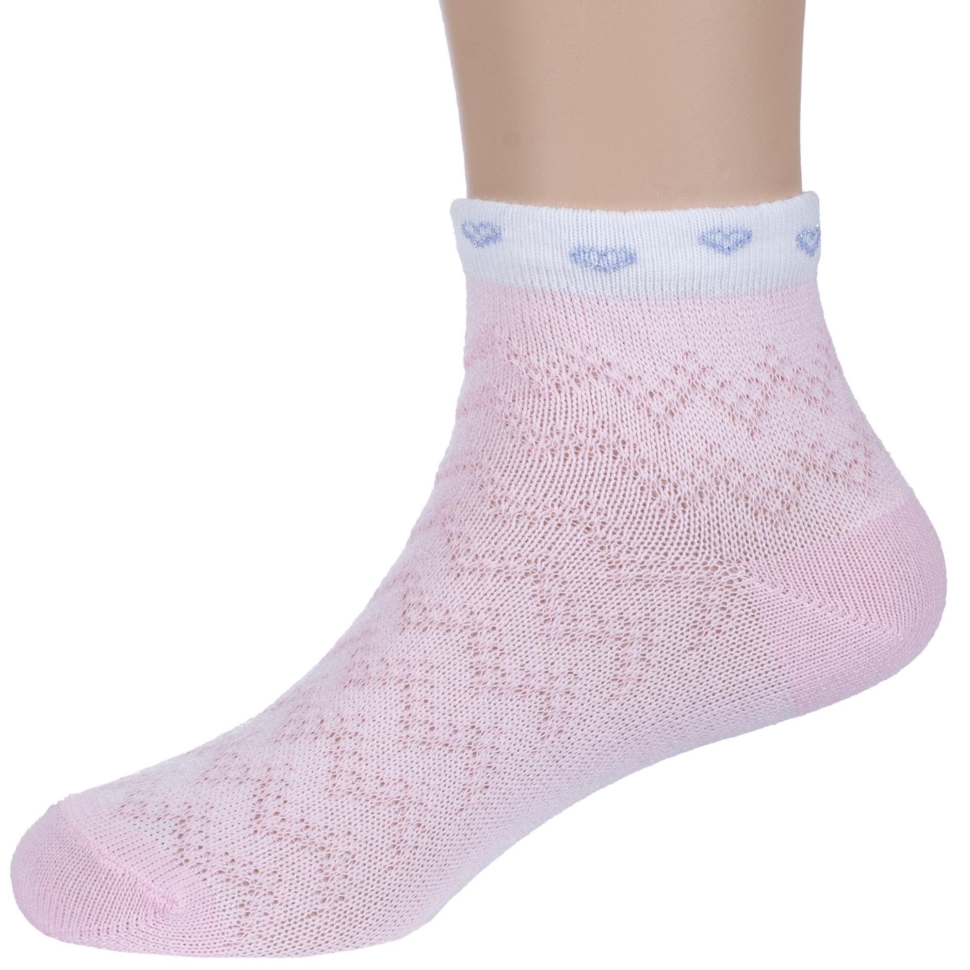 Летние укороченные детские носки, цвет розовый, ажурные, шов обычный (не бесшовные), принт (рисунок): сердечки / поцелуи / любовь, контрастные пятка / мысок / резинка, зигзаг / молния, блеск люрекса, с узором, состав: 82% хлопок, 14% полиамид, 4% эластан, арт. 8С49. Производитель «АО Борисоглебский трикотаж, Воронежская обл, Россия» под брендом «Борисоглебский трикотаж».