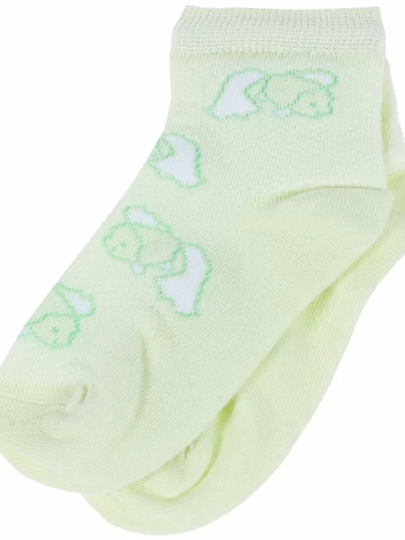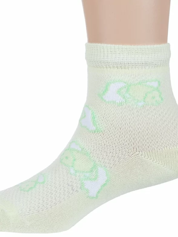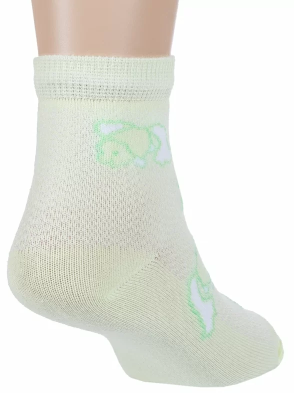 Летние укороченные детские носки, цвет салатовый, в сеточку, повседневные, шов обычный (не бесшовные), принт (рисунок): животные, с узором, состав: 85% хлопок, 12% полиамид, 3% эластан, арт. 8С903. Производитель «АО Борисоглебский трикотаж, Воронежская обл, Россия» под брендом «Борисоглебский трикотаж».