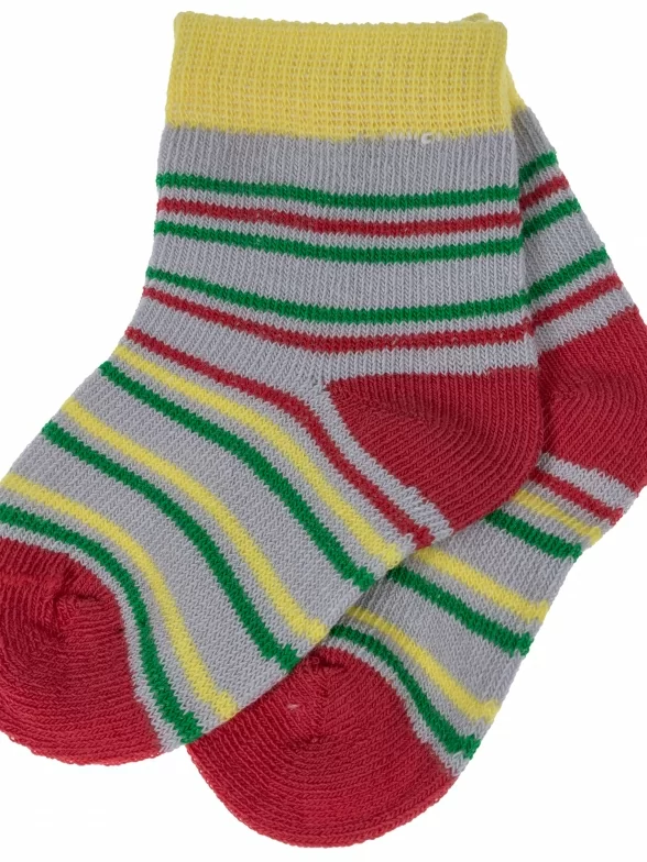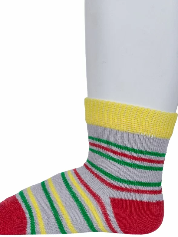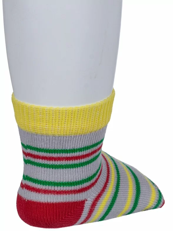 Круглогодичные укороченные детские носки, цвет серый, классические, шов кеттельный (бесшовная технология), принт (рисунок): полоски, контрастные пятка / мысок / резинка, с узором, состав: 77% хлопок, 20% полиэстер, 3% эластан, арт. 8С1000-К. Производитель «АО Борисоглебский трикотаж, Воронежская обл, Россия» под брендом «Борисоглебский трикотаж».