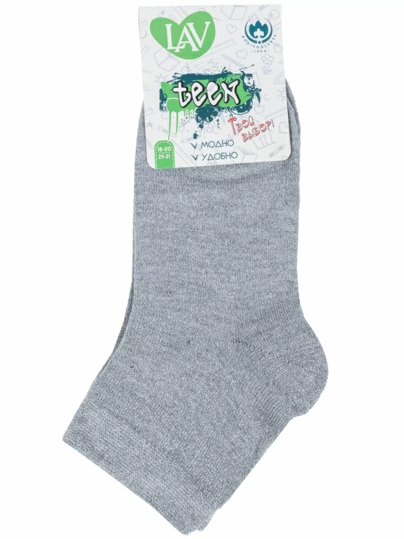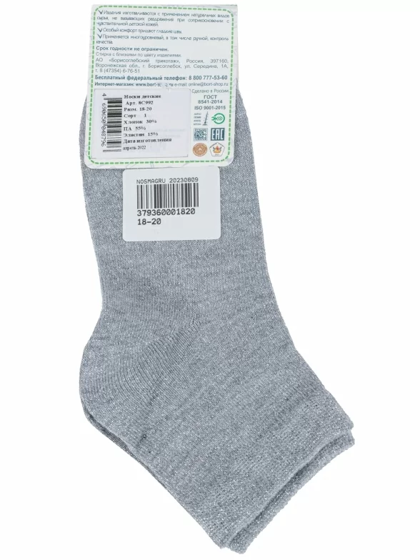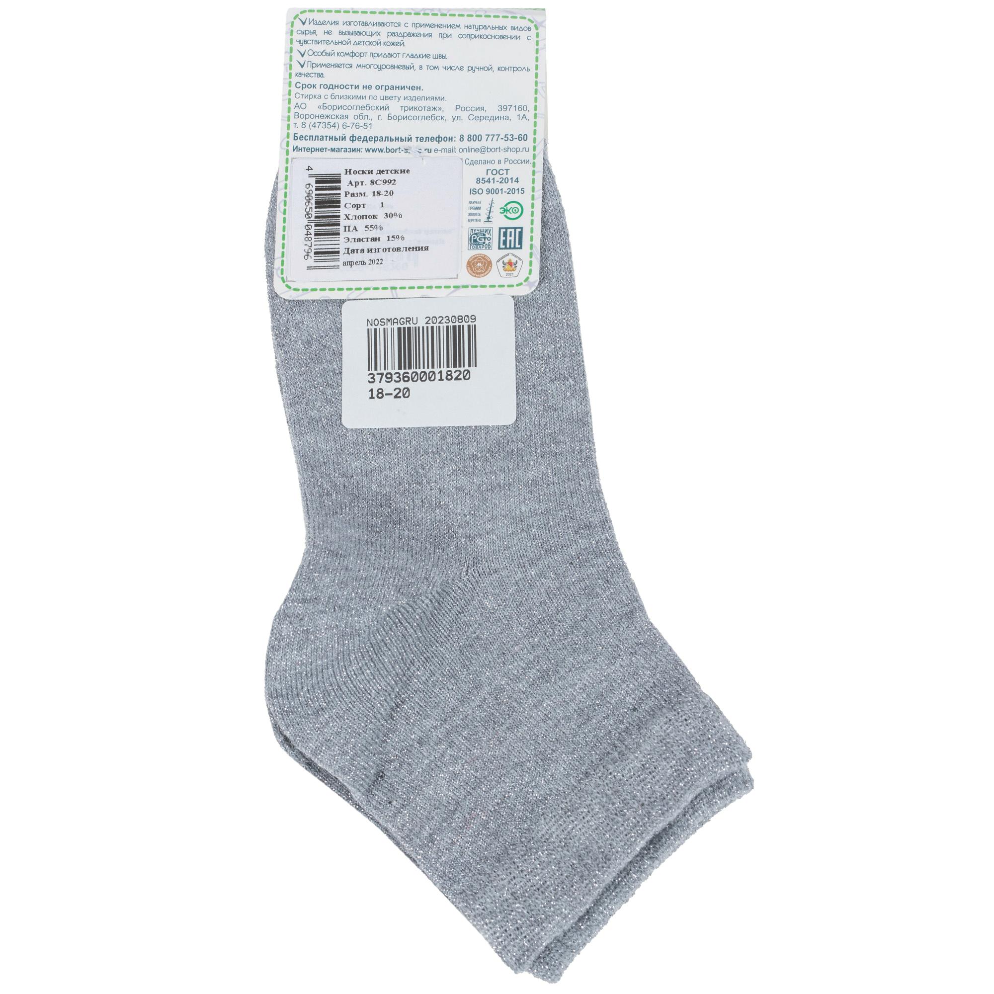 Круглогодичные укороченные детские носки, цвет серый, классические, состав: 30% хлопок, 55% полиамид, 15% эластан, арт. 8С992. Производитель «АО Борисоглебский трикотаж, Воронежская обл, Россия» под брендом «Борисоглебский трикотаж».