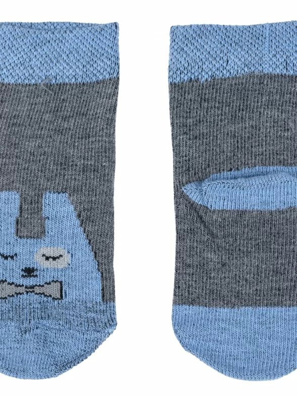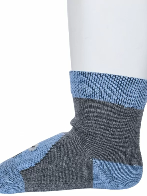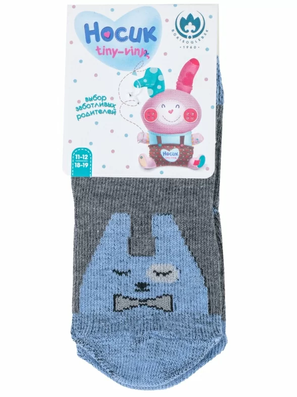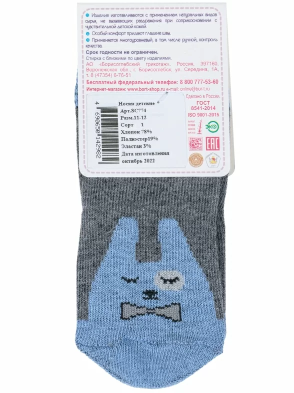 Круглогодичные укороченные детские носки, цвет серый, повседневные, шов обычный (не бесшовные), принт (рисунок): контрастные пятка / мысок / резинка, животные, с узором, состав: 78% хлопок, 19% полиэстер, 3% эластан, арт. 8С774. Производитель «АО Борисоглебский трикотаж, Воронежская обл, Россия» под брендом «Борисоглебский трикотаж».