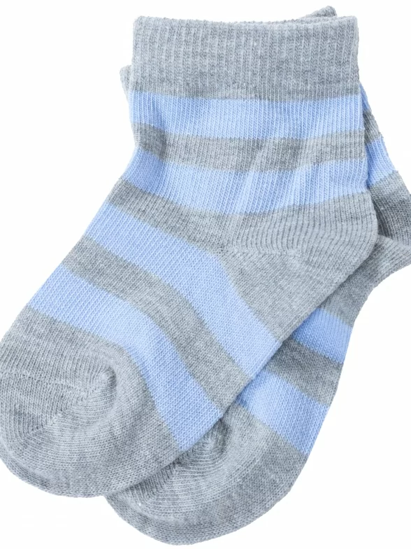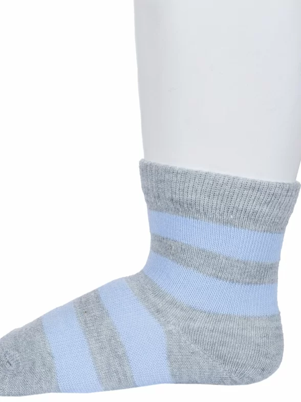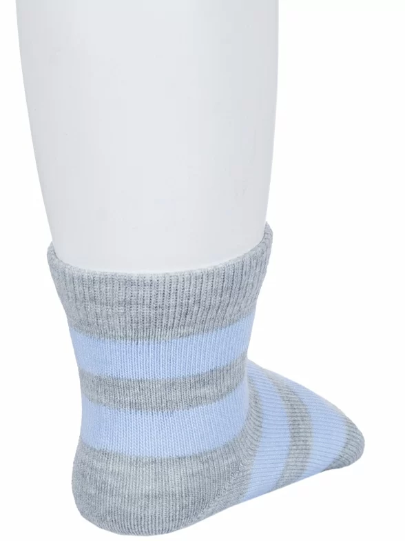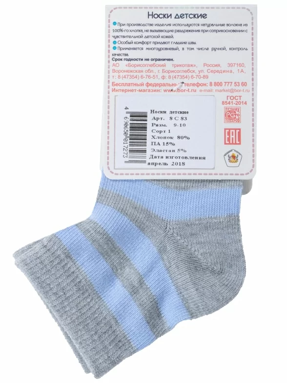 Круглогодичные укороченные детские носки, цвет серый, классические, шов обычный (не бесшовные), принт (рисунок): полоски, контрастные пятка / мысок / резинка, с узором, состав: 80% хлопок, 15% полиамид, 5% эластан, арт. 8С83. Производитель «АО Борисоглебский трикотаж, Воронежская обл, Россия» под брендом «Борисоглебский трикотаж».