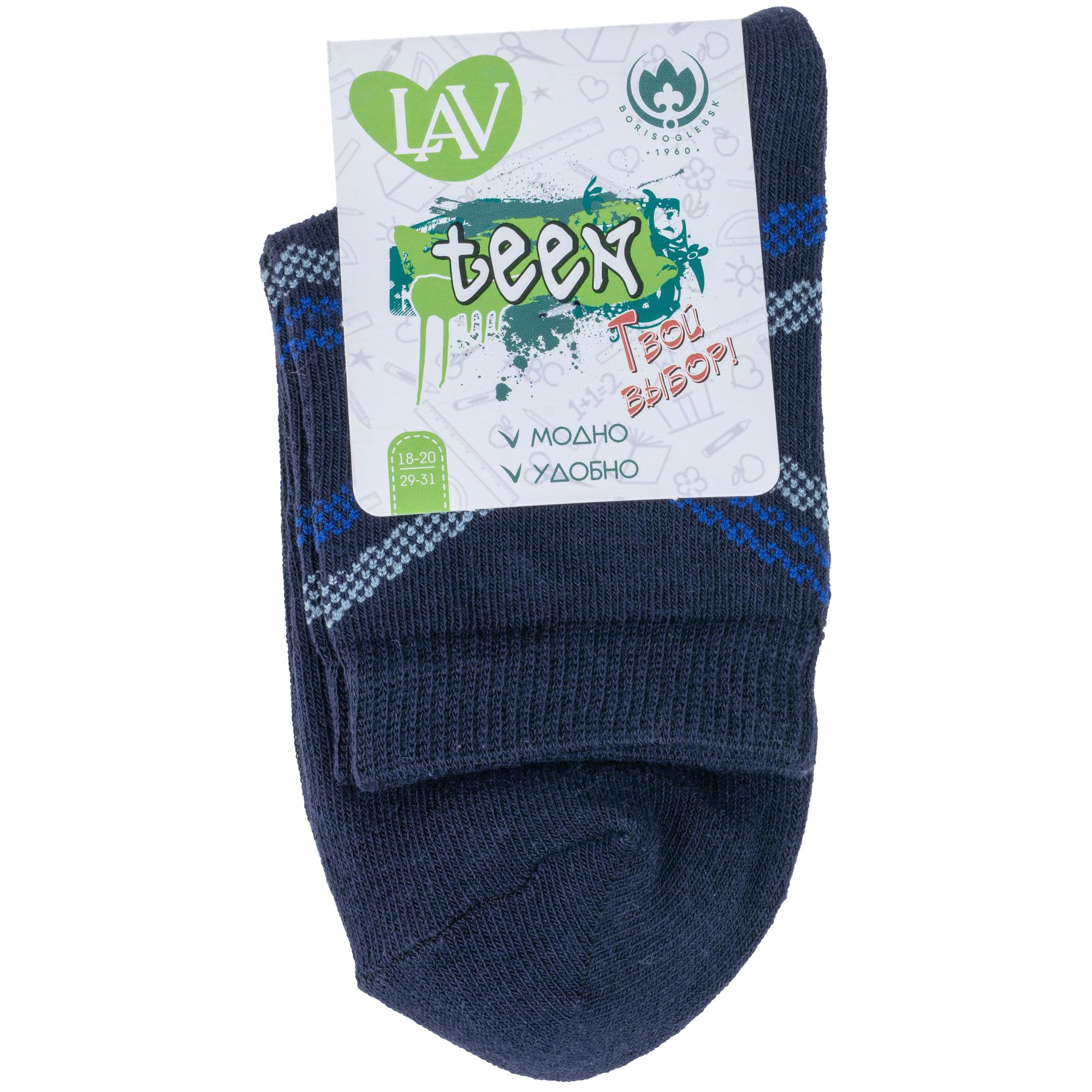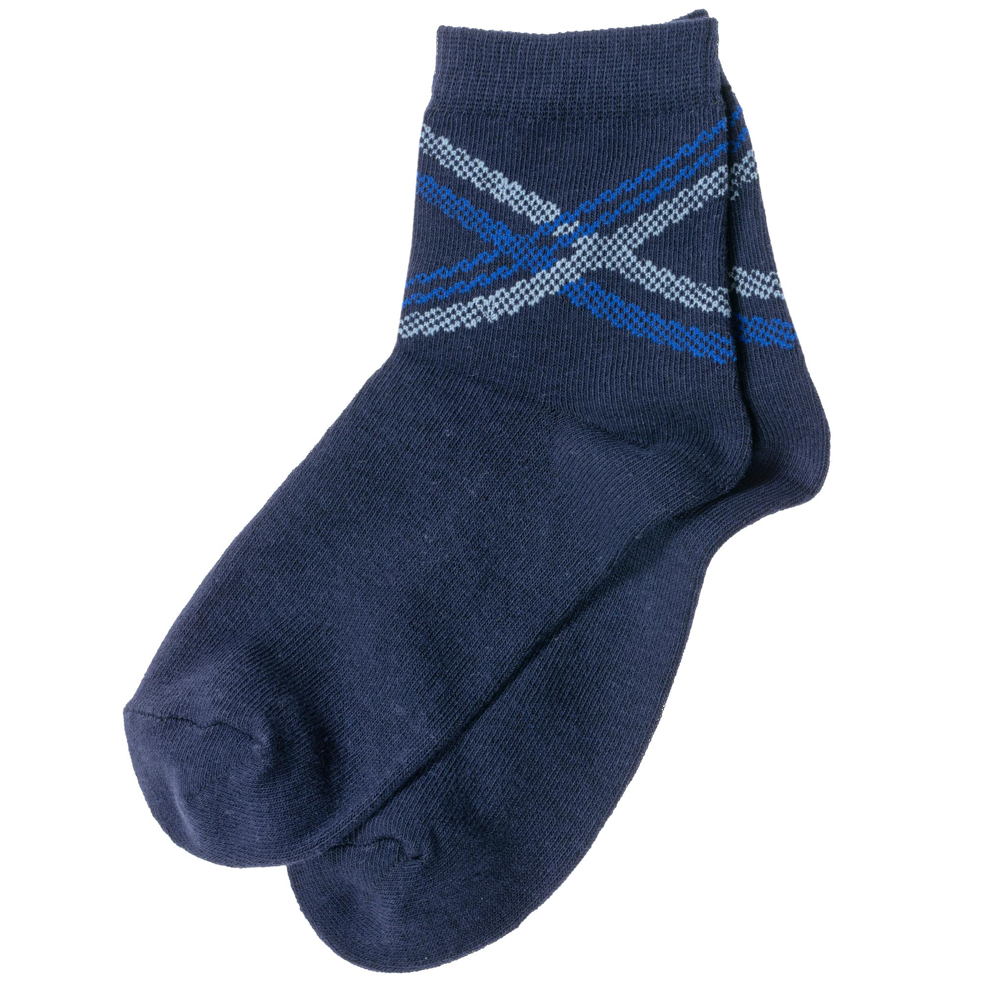 Круглогодичные укороченные детские носки, цвет синий, классические, шов обычный (не бесшовные), принт (рисунок): полоски, абстрактный, с узором, состав: 73% хлопок, 24% полиэстер, 3% эластан, арт. 8С761. Производитель «АО Борисоглебский трикотаж, Воронежская обл, Россия» под брендом «Борисоглебский трикотаж».