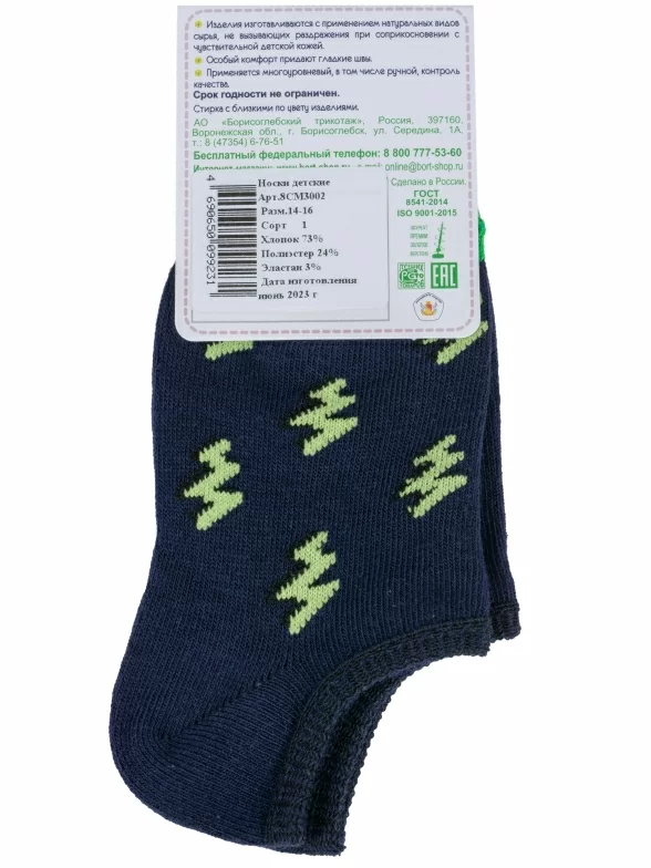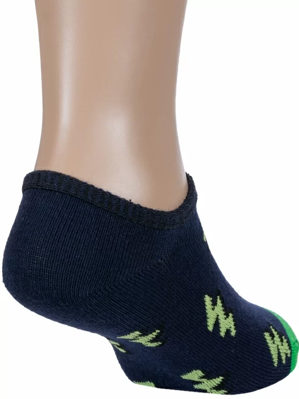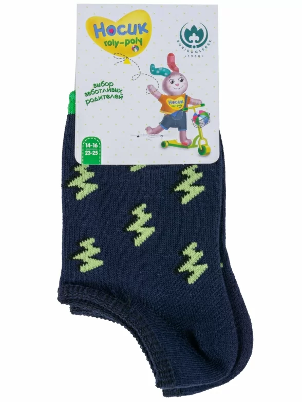 Круглогодичные ультракороткие детские носки, цвет синий, повседневные, шов обычный (не бесшовные), принт (рисунок): контрастные пятка / мысок / резинка, зигзаг / молния, с узором, состав: 73% хлопок, 24% полиэстер, 3% эластан, арт. 8СМ3002. Производитель «АО Борисоглебский трикотаж, Воронежская обл, Россия» под брендом «Борисоглебский трикотаж».