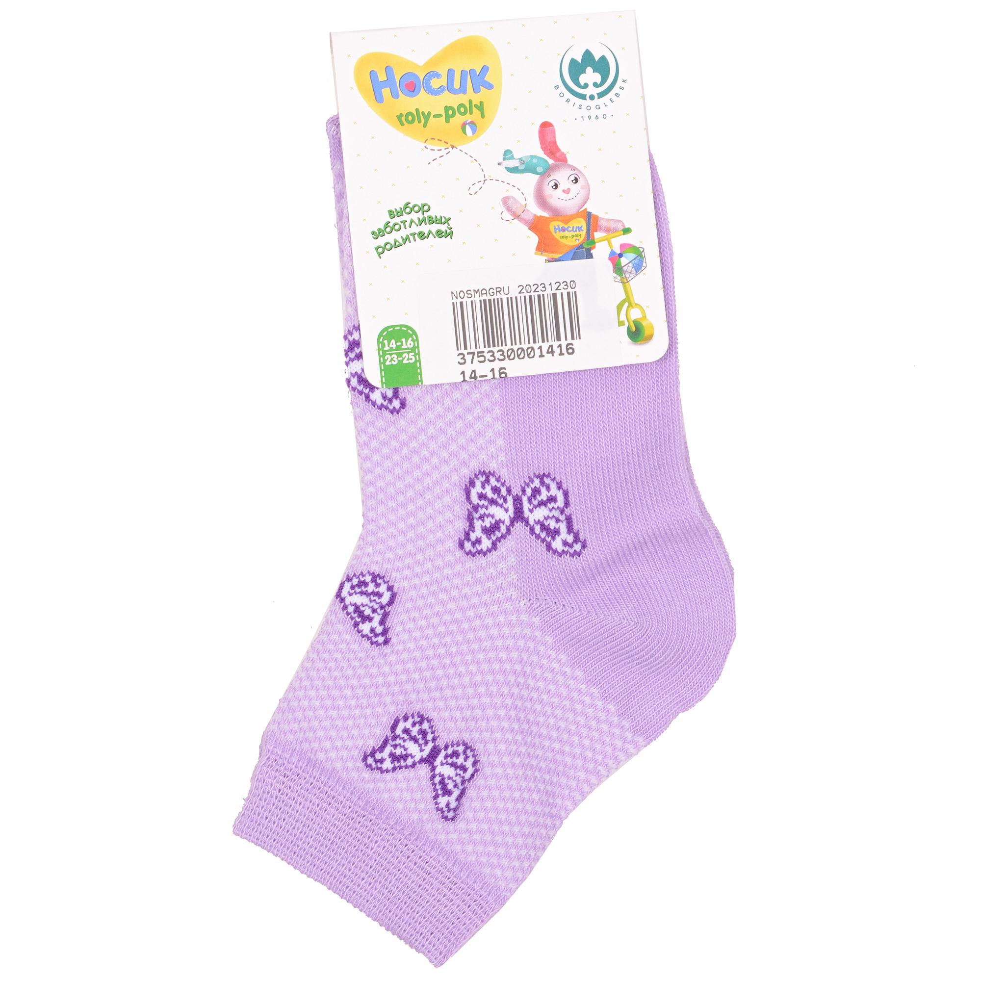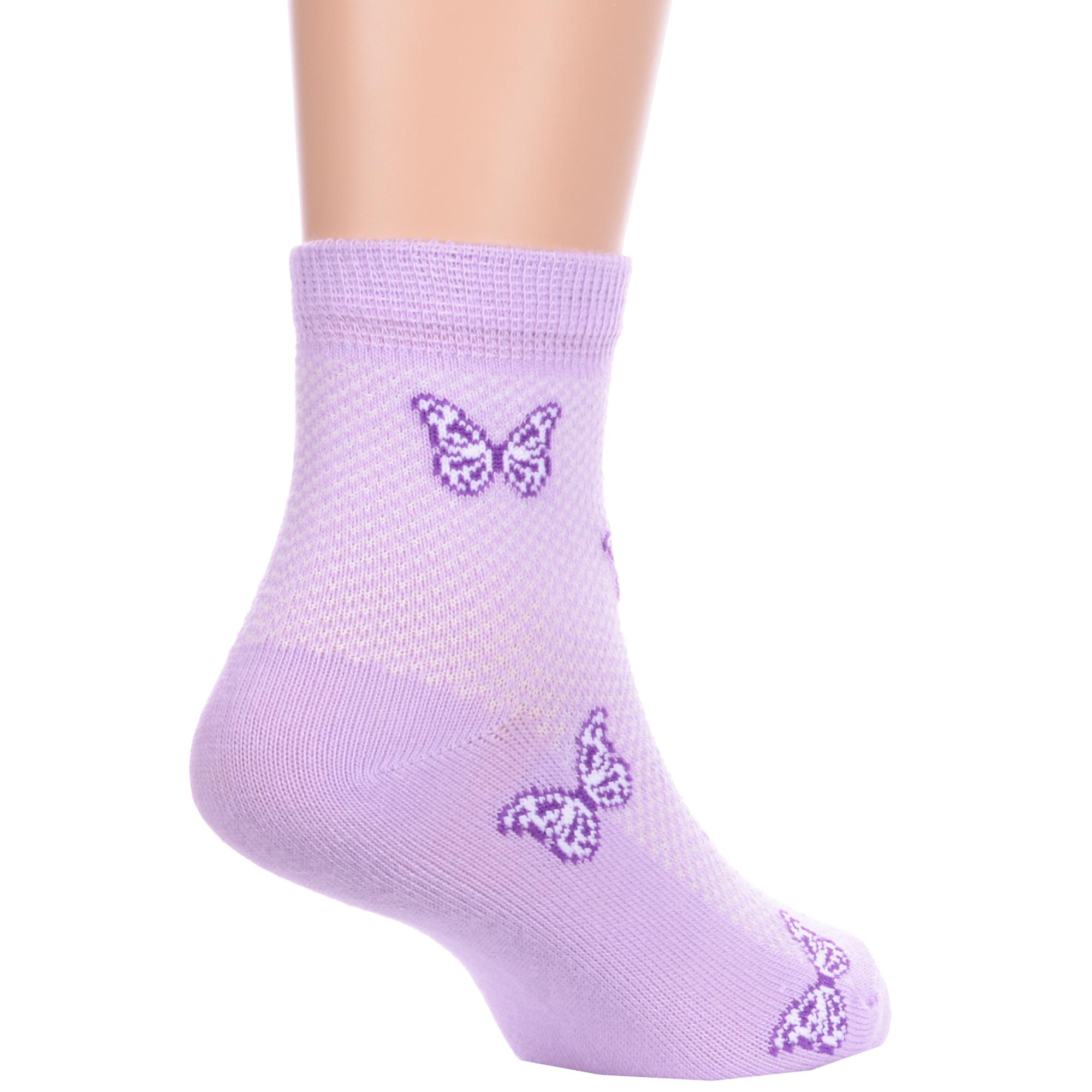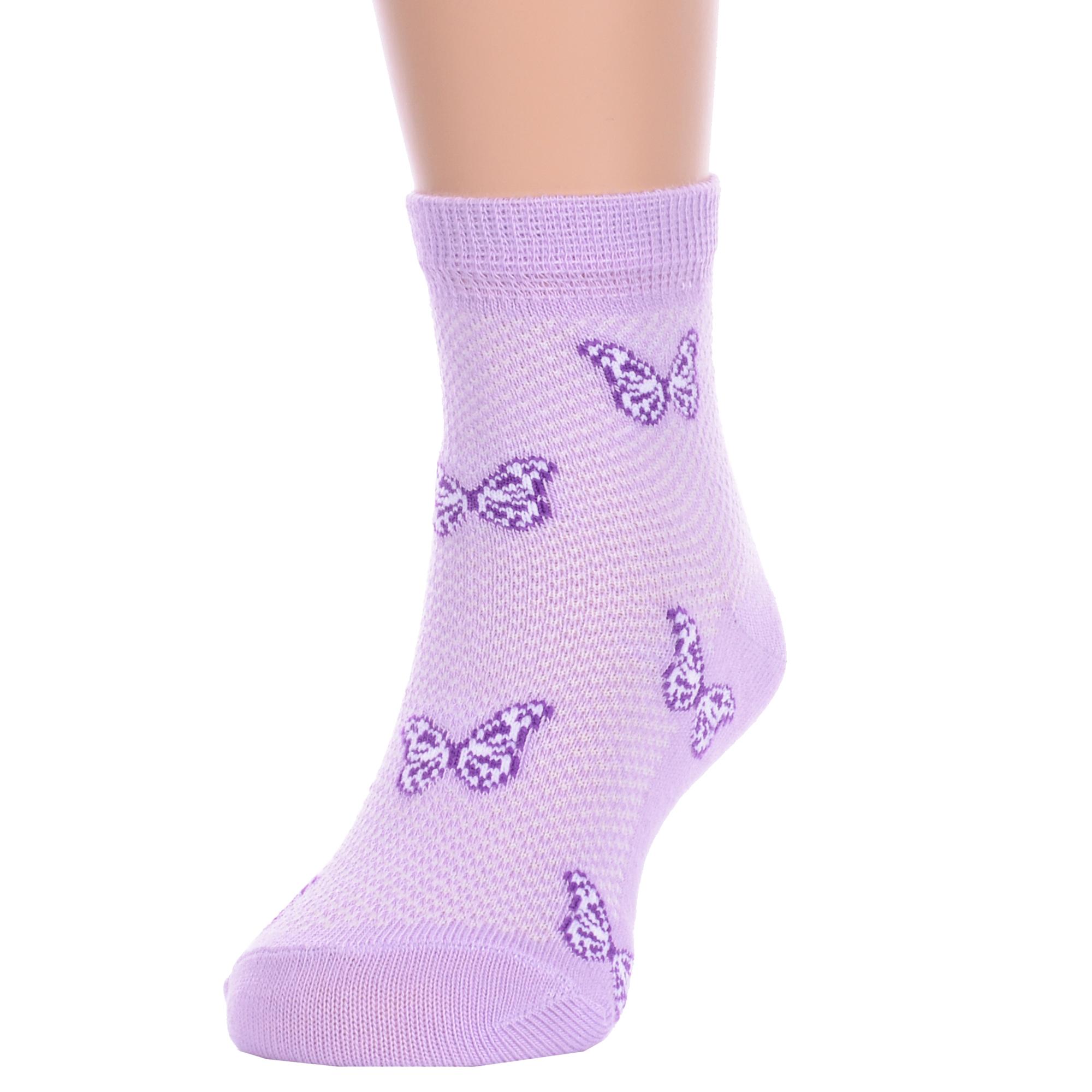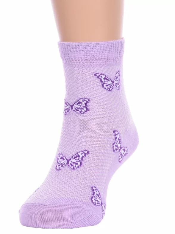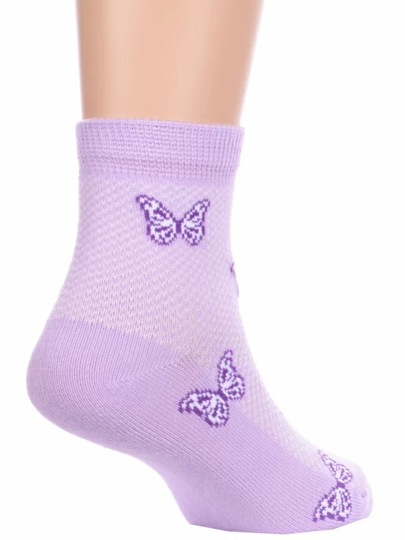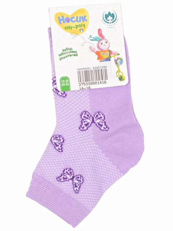 Летние укороченные детские носки, цвет сиреневый, повседневные, ажурные, шов обычный (не бесшовные), принт (рисунок): бабочки / бантики, с узором, состав: 67% хлопок, 30% полиамид, 3% эластан, арт. 8С3000/1. Производитель «АО Борисоглебский трикотаж, Воронежская обл, Россия» под брендом «Борисоглебский трикотаж».