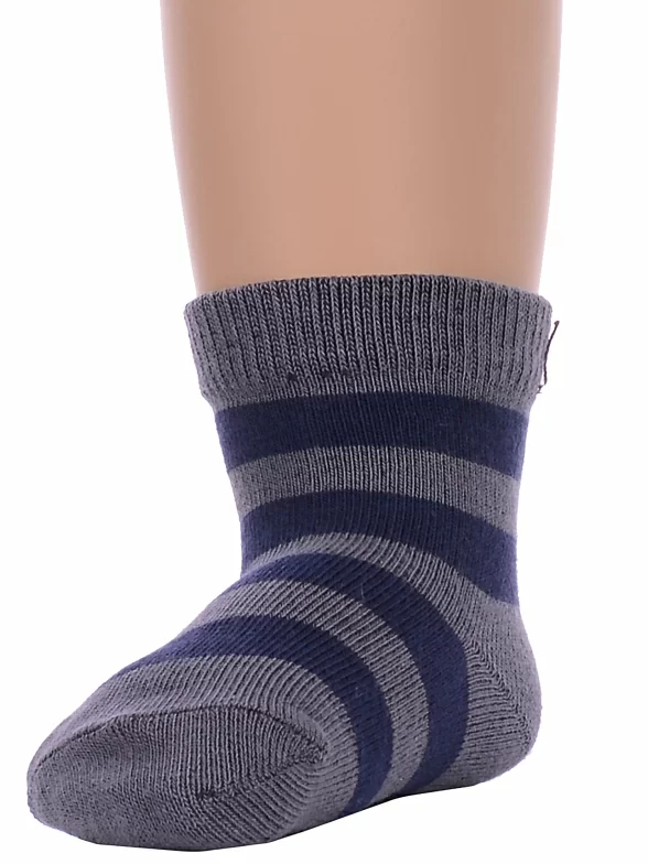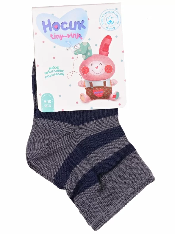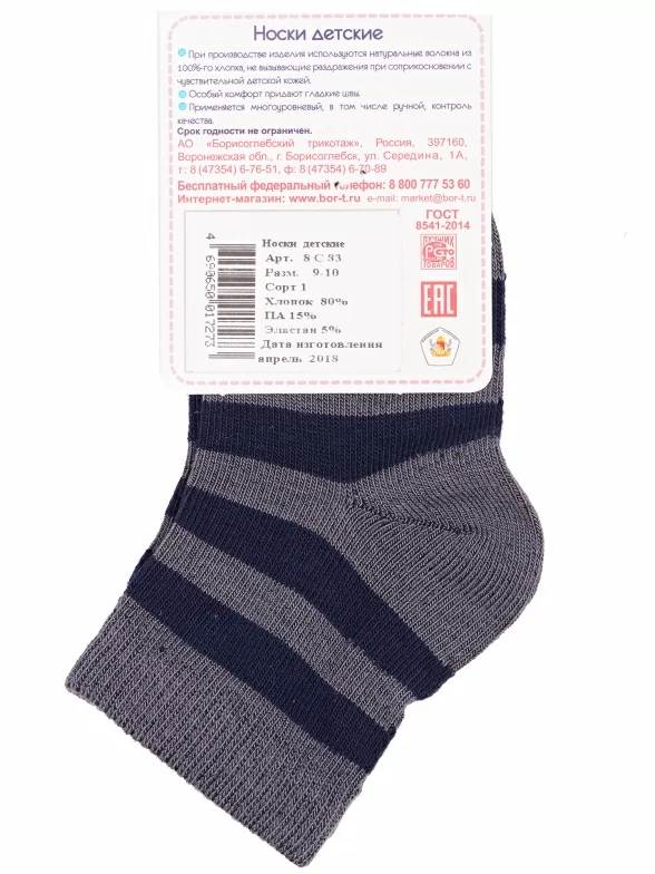 Круглогодичные укороченные детские носки, цвет темно-серый, повседневные, шов обычный (не бесшовные), принт (рисунок): полоски, контрастные пятка / мысок / резинка, с узором, состав: 80% хлопок, 15% полиамид, 5% эластан, арт. 8С83. Производитель «АО Борисоглебский трикотаж, Воронежская обл, Россия» под брендом «Борисоглебский трикотаж».
