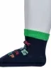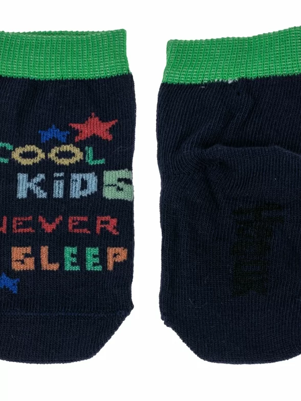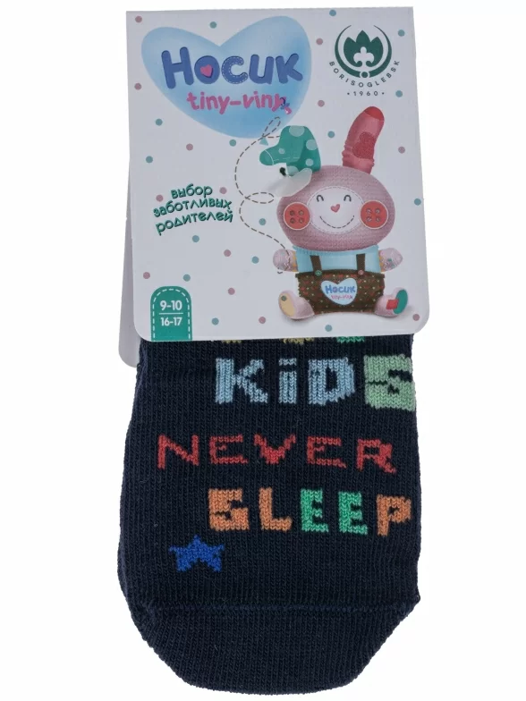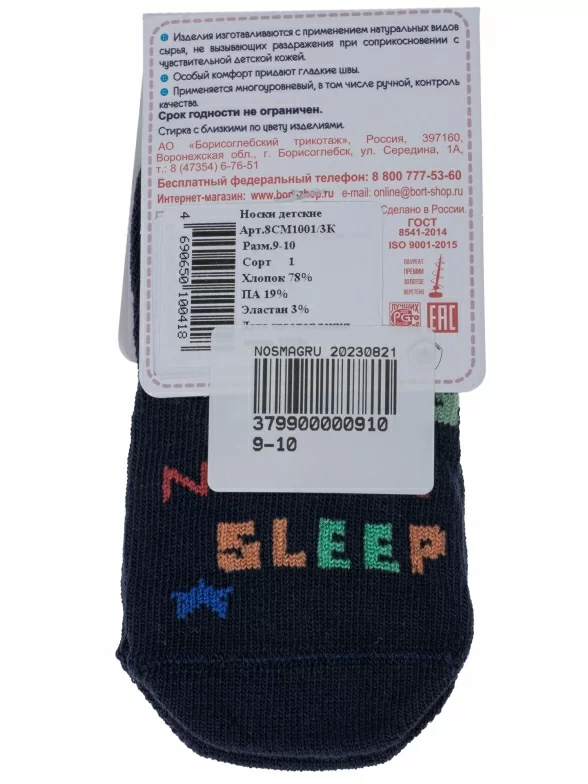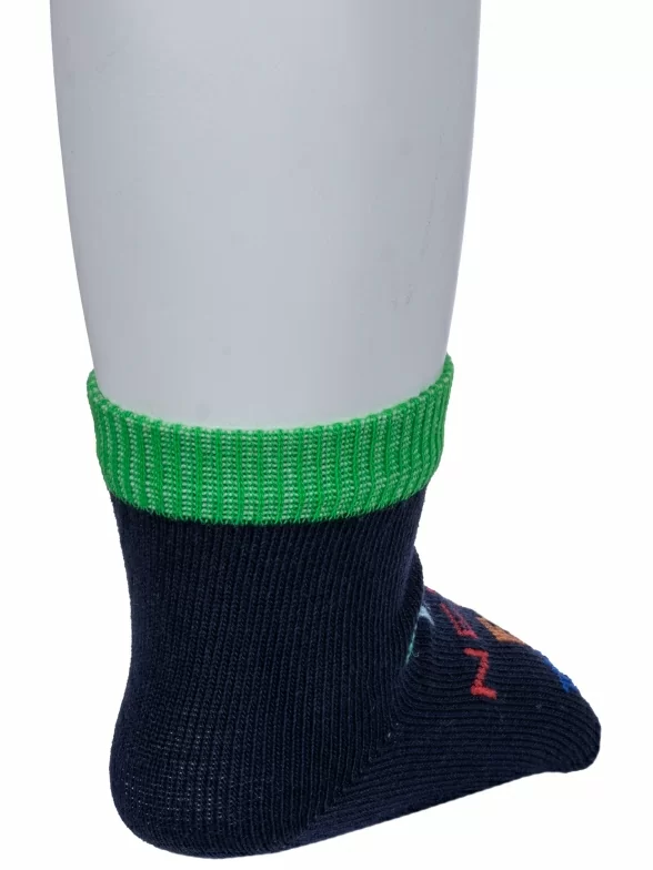Круглогодичные укороченные детские носки, цвет темно-синий, повседневные, шов кеттельный (бесшовная технология), принт (рисунок): надписи, контрастные пятка / мысок / резинка, с узором, состав: 78% хлопок, 19% полиамид, 3% эластан, арт. 8СМ1001/3-К. Производитель «АО Борисоглебский трикотаж, Воронежская обл, Россия» под брендом «Борисоглебский трикотаж».