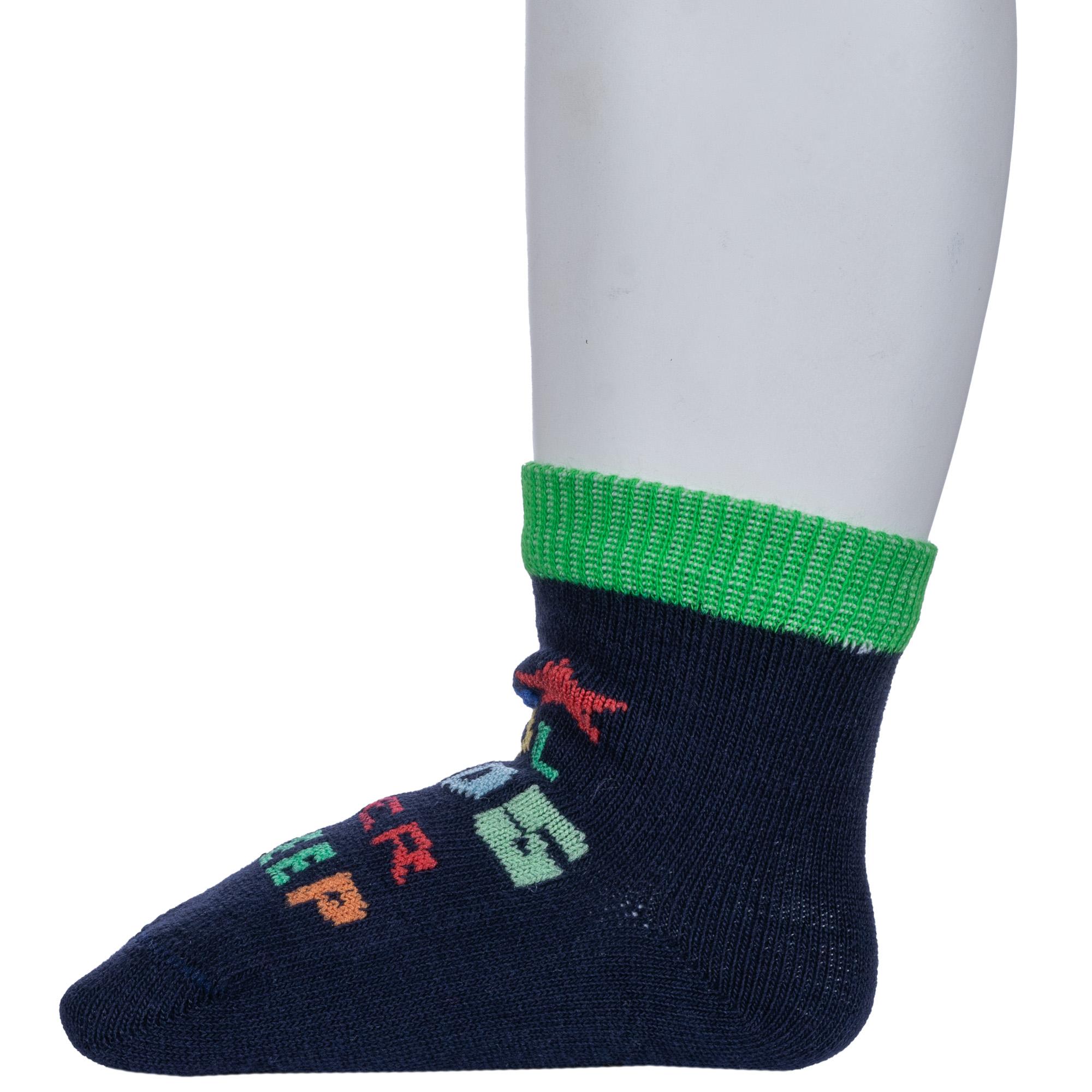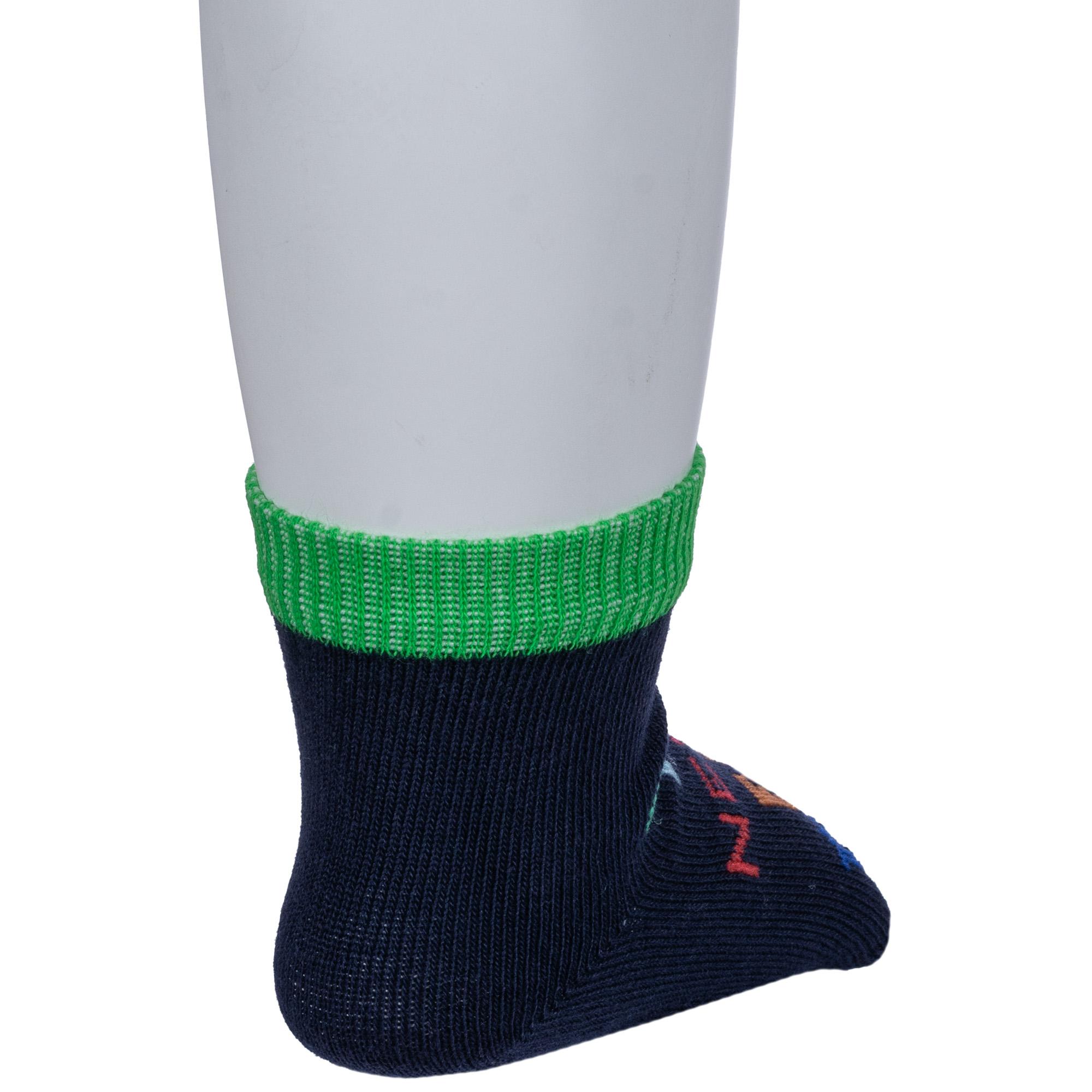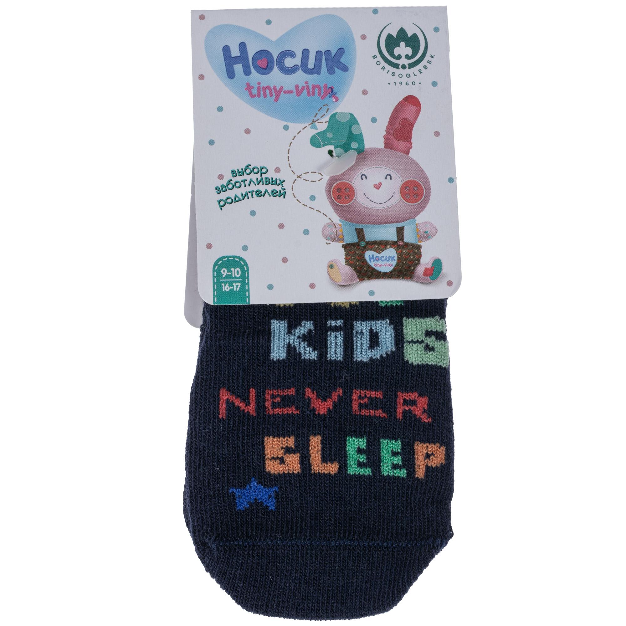 Круглогодичные укороченные детские носки, цвет темно-синий, повседневные, шов кеттельный (бесшовная технология), принт (рисунок): надписи, контрастные пятка/мысок/резинка, с узором, состав: 78% хлопок, 19% полиамид, 3% эластан, арт. 8СМ1001/3-К. Производитель «АО Борисоглебский трикотаж, Воронежская обл, Россия» под брендом «Борисоглебский трикотаж».