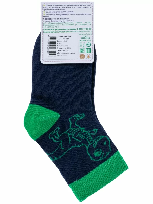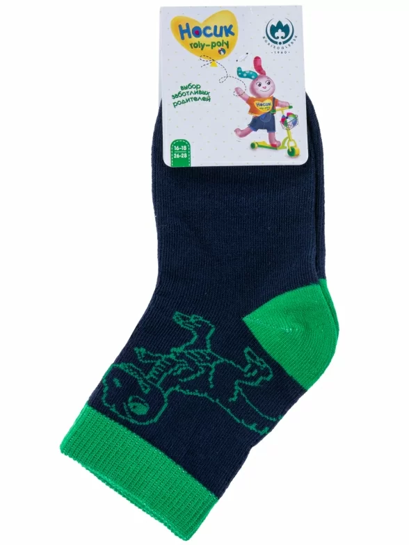 Круглогодичные укороченные детские носки, цвет темно-синий, повседневные, шов обычный (не бесшовные), принт (рисунок): животные, с узором, состав: 77% хлопок, 20% полиэстер, 3% эластан, арт. 8С740. Производитель «АО Борисоглебский трикотаж, Воронежская обл, Россия» под брендом «Борисоглебский трикотаж».