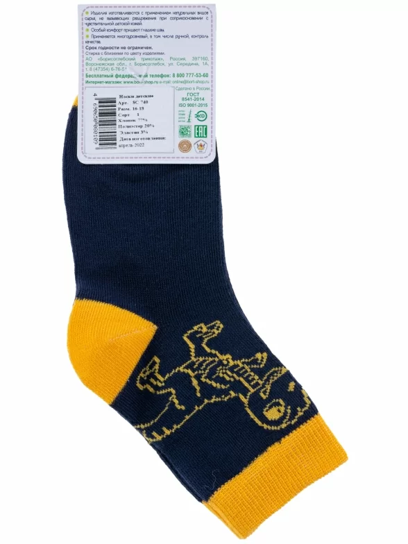 Круглогодичные укороченные детские носки, цвет темно-синий, повседневные, шов обычный (не бесшовные), принт (рисунок): животные, с узором, состав: 77% хлопок, 20% полиэстер, 3% эластан, арт. 8С740. Производитель «АО Борисоглебский трикотаж, Воронежская обл, Россия» под брендом «Борисоглебский трикотаж».