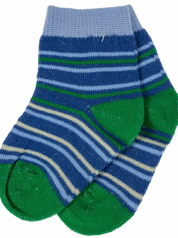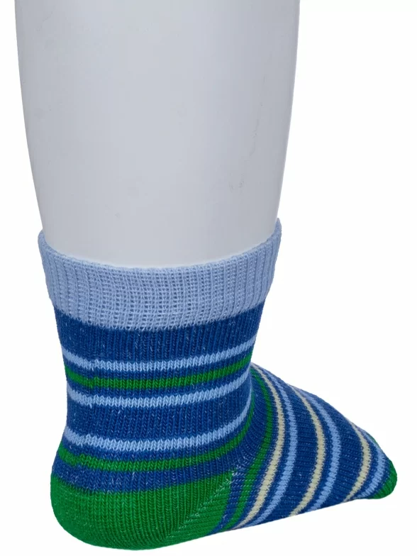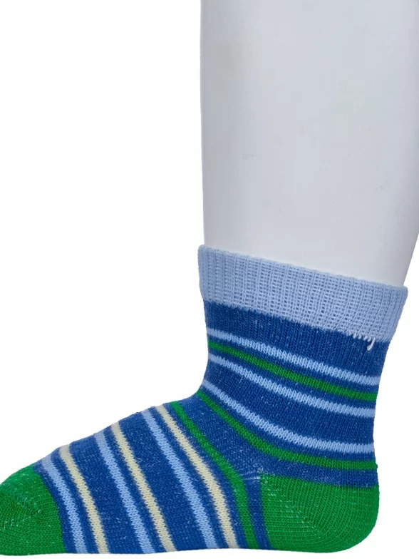 Круглогодичные укороченные детские носки, цвет синий, классические, шов кеттельный (бесшовная технология), принт (рисунок): полоски, контрастные пятка / мысок / резинка, с узором, состав: 77% хлопок, 20% полиэстер, 3% эластан, арт. 8С1000-К. Производитель «АО Борисоглебский трикотаж, Воронежская обл, Россия» под брендом «Борисоглебский трикотаж».
