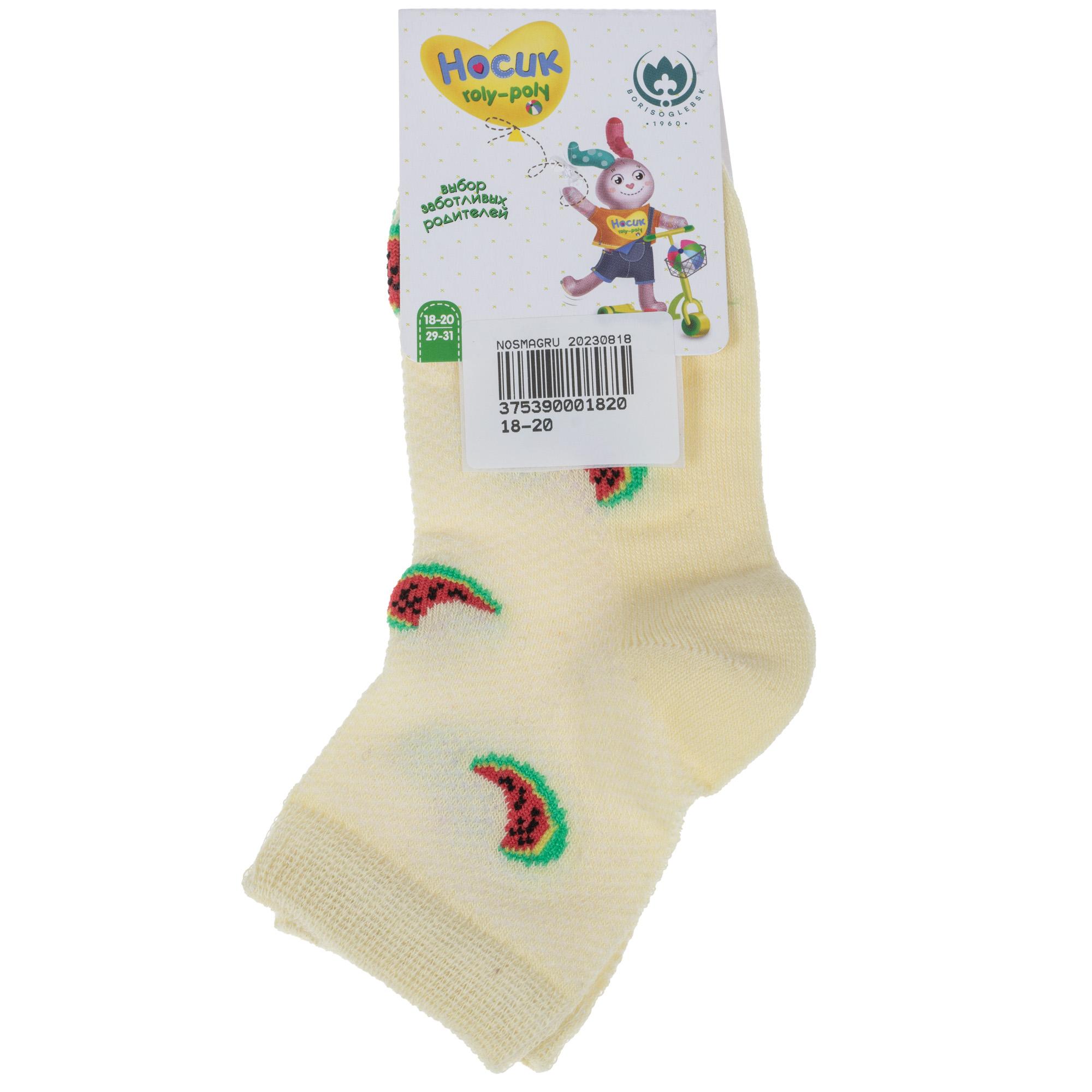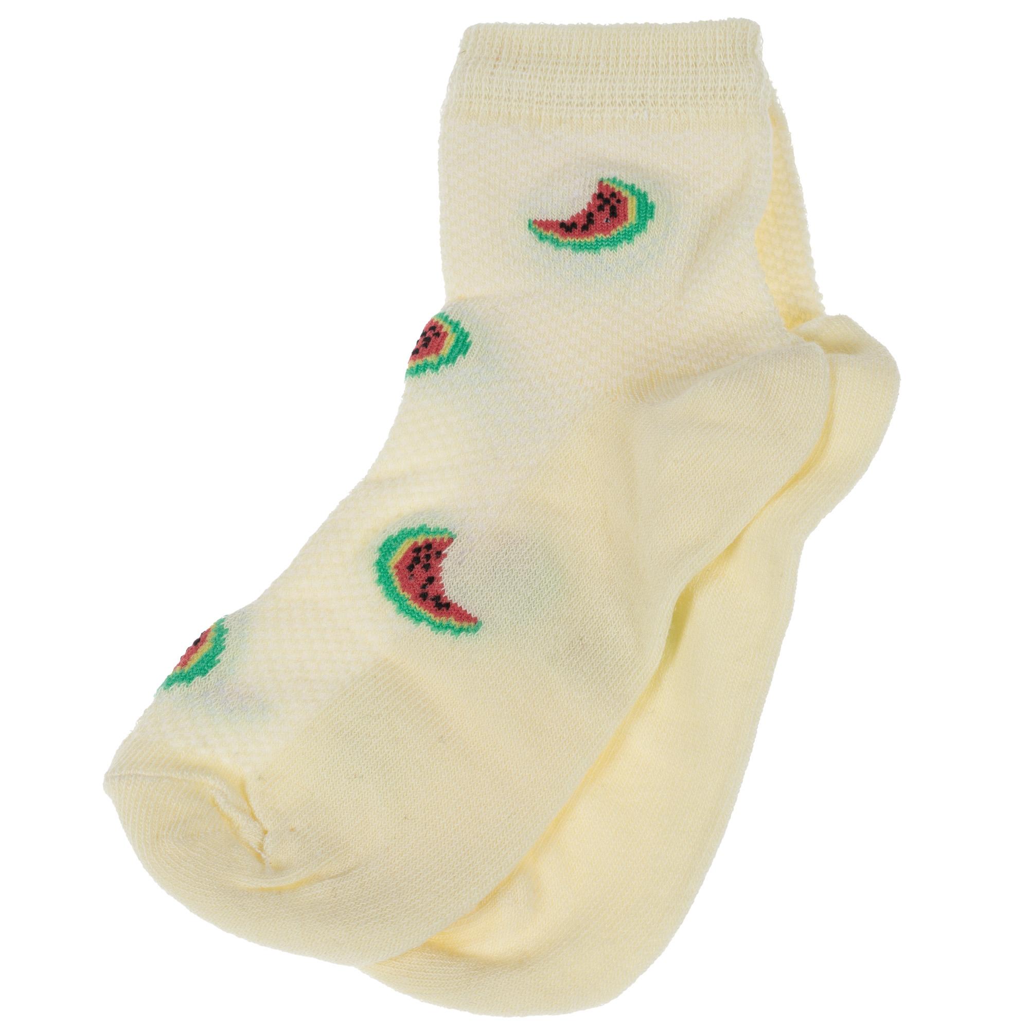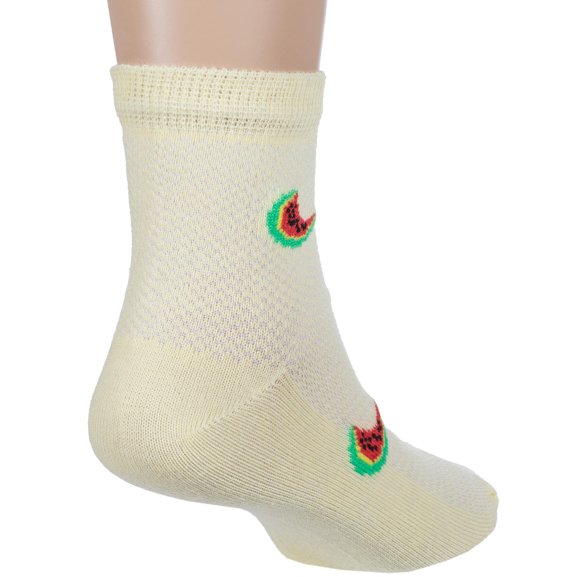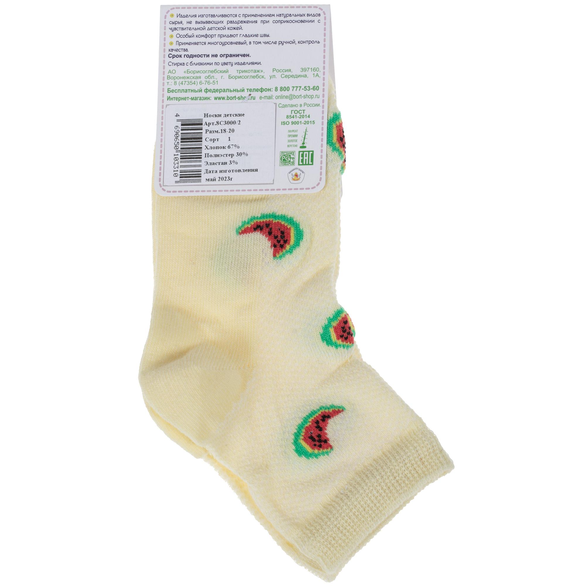 Летние укороченные детские носки, цвет желтый, в сеточку, ажурные, повседневные, шов обычный (не бесшовные), принт (рисунок): овощи / фрукты / ягоды, с узором, состав: 67% хлопок, 30% полиэстер, 3% эластан, арт. 8С3000/2. Производитель «АО Борисоглебский трикотаж, Воронежская обл, Россия» под брендом «Борисоглебский трикотаж».