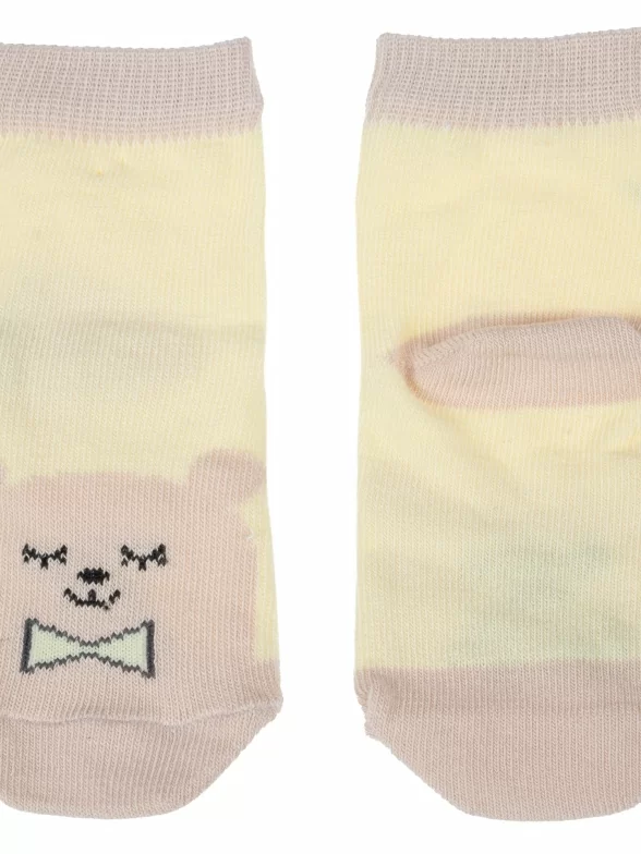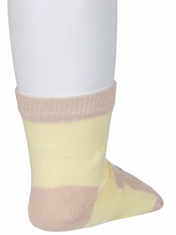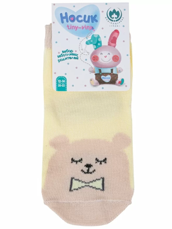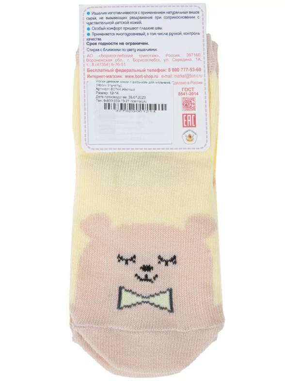 Круглогодичные укороченные детские носки, цвет желтый, повседневные, шов обычный (не бесшовные), принт (рисунок): контрастные пятка / мысок / резинка, животные, с узором, состав: 76% хлопок, 21% полиэстер, 3% эластан, арт. 8С744. Производитель «АО Борисоглебский трикотаж, Воронежская обл, Россия» под брендом «Борисоглебский трикотаж».
