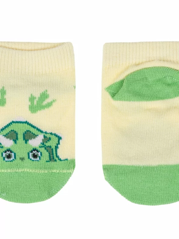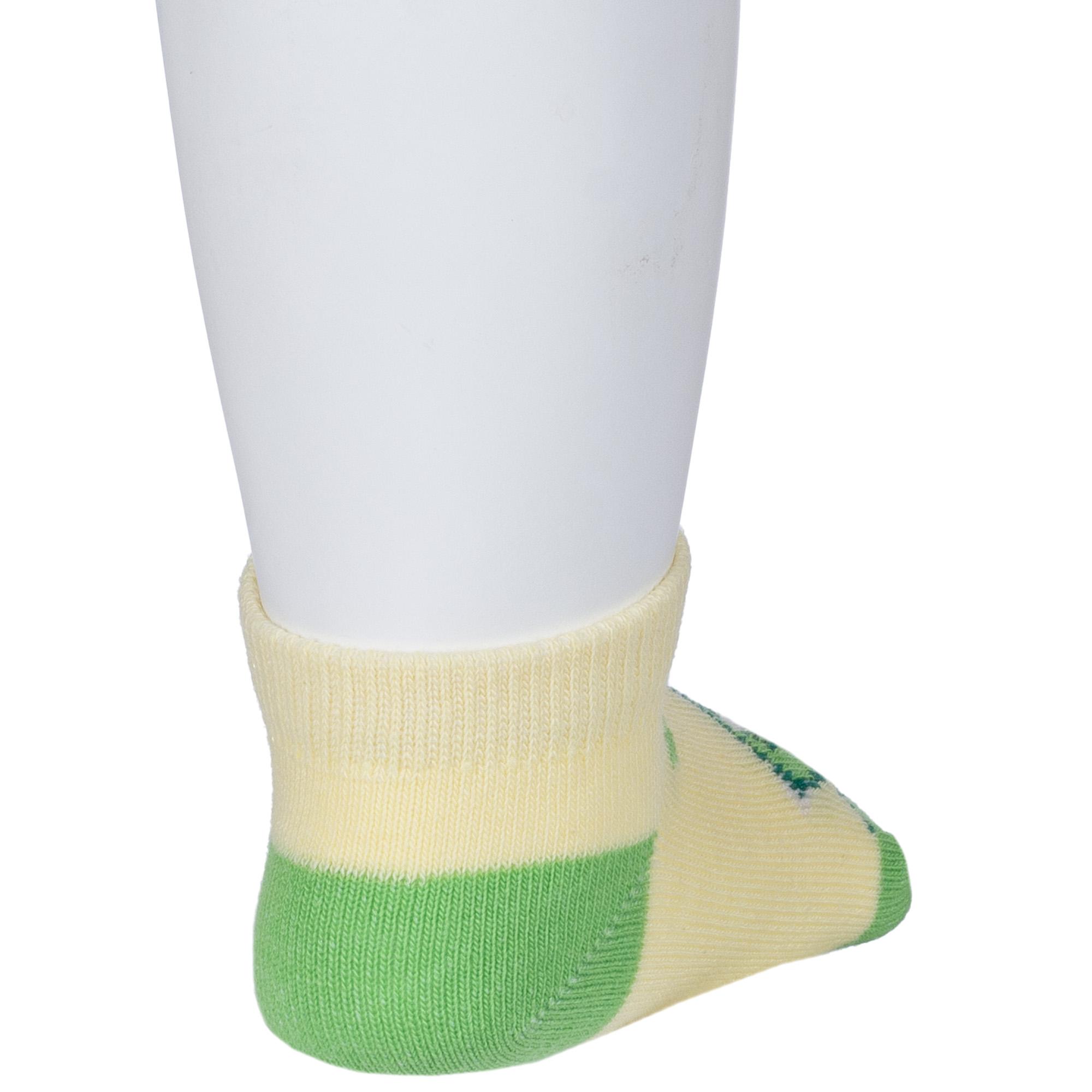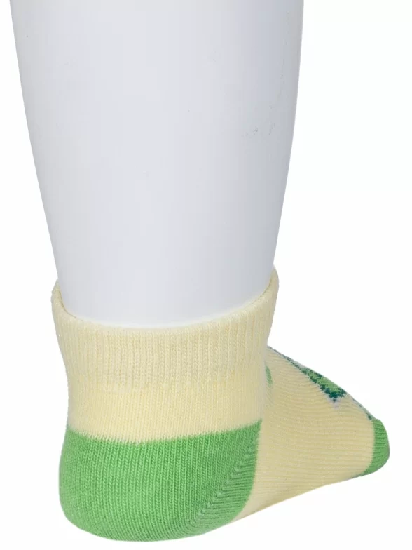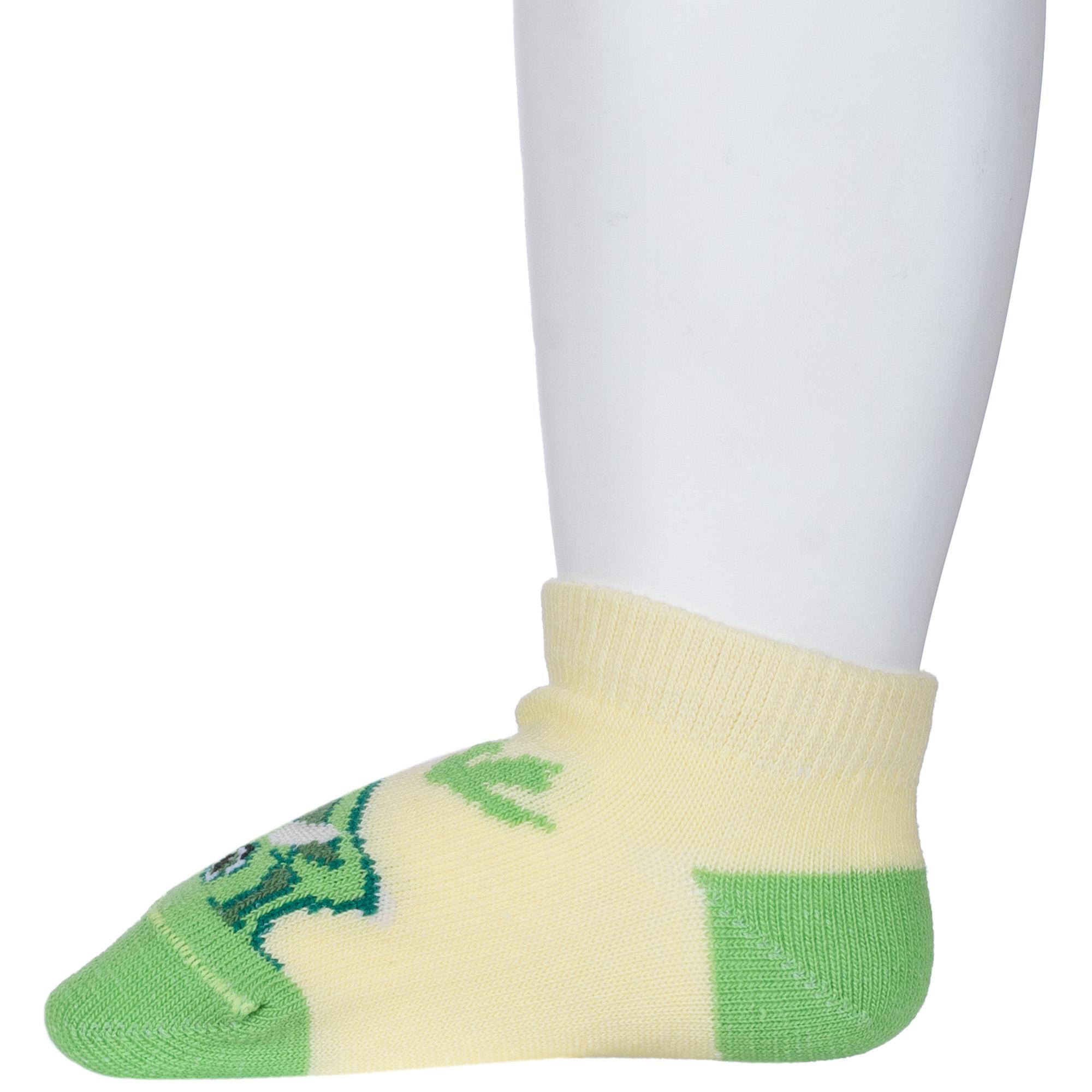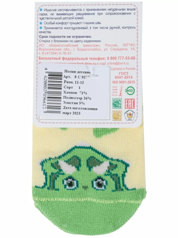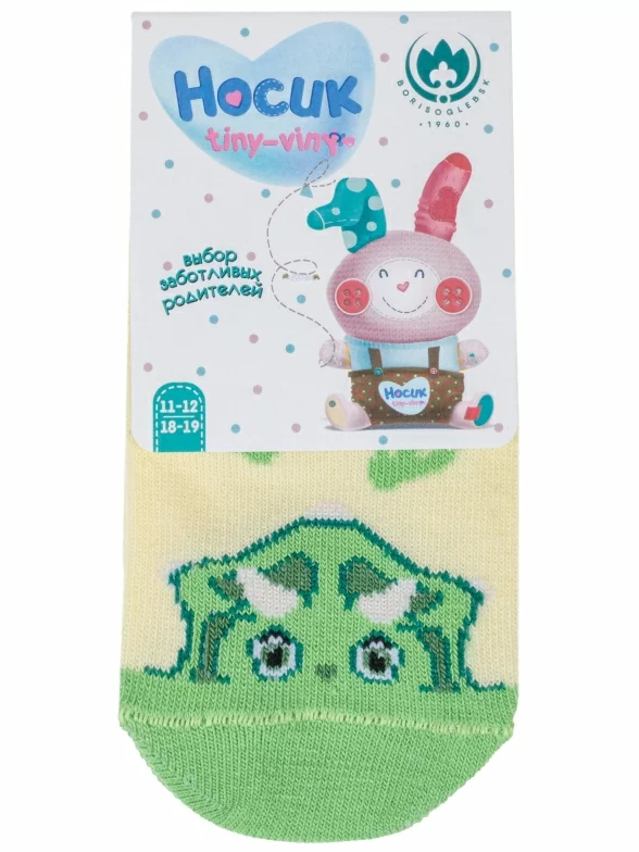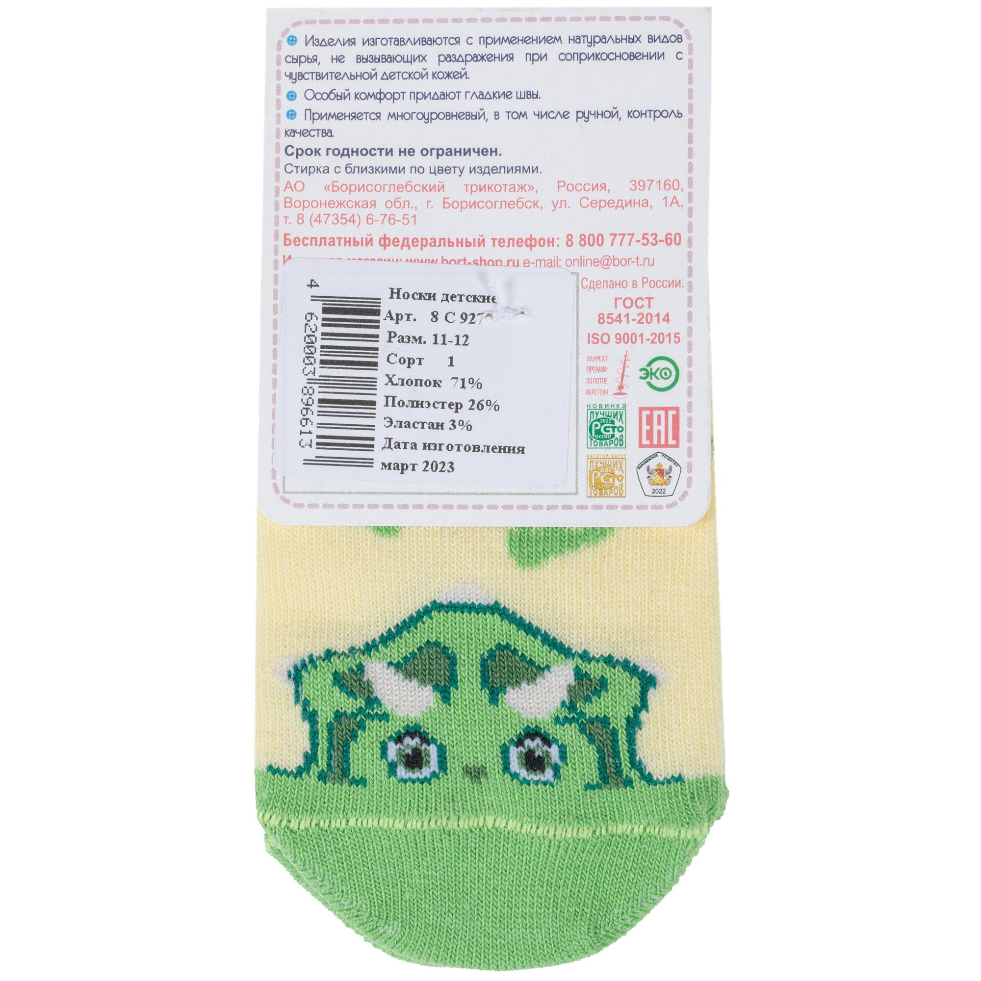 Круглогодичные короткие детские носки, цвет желтый, повседневные, шов обычный (не бесшовные), принт (рисунок): контрастные пятка / мысок / резинка, животные, с узором, состав: 71% хлопок, 26% полиэстер, 3% эластан, арт. 8С927. Производитель «АО Борисоглебский трикотаж, Воронежская обл, Россия» под брендом «Борисоглебский трикотаж».