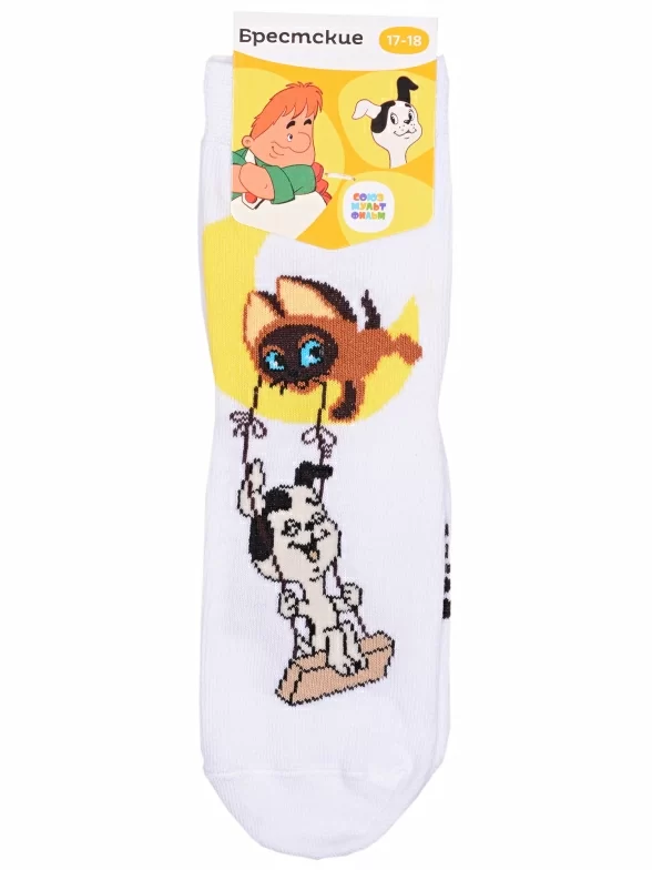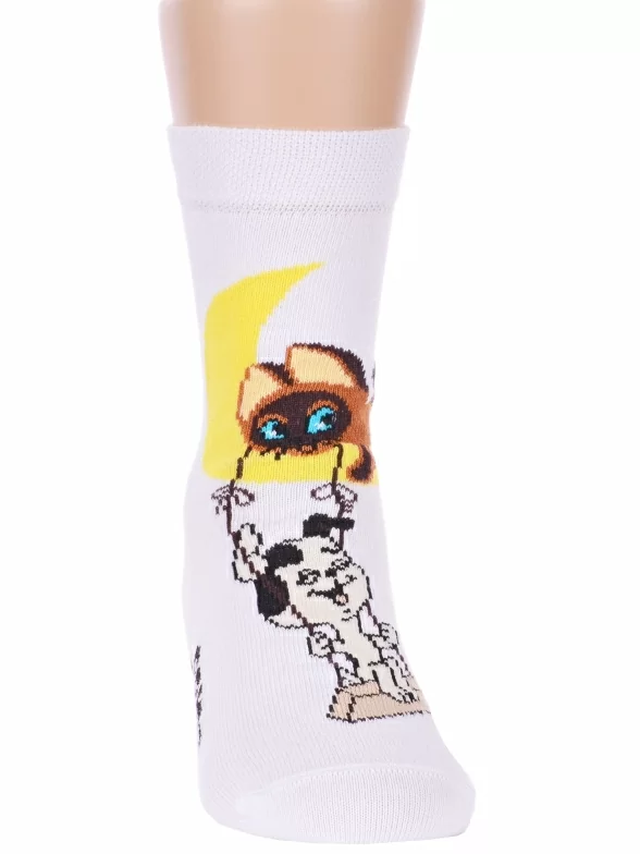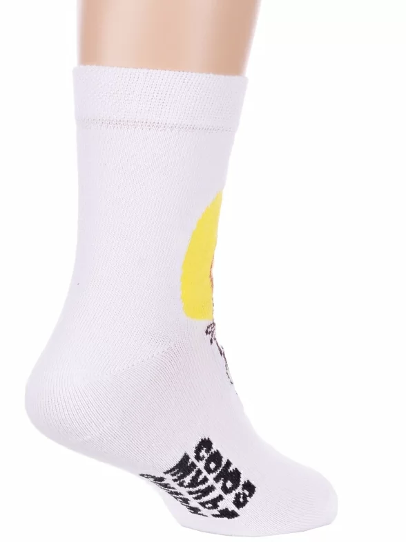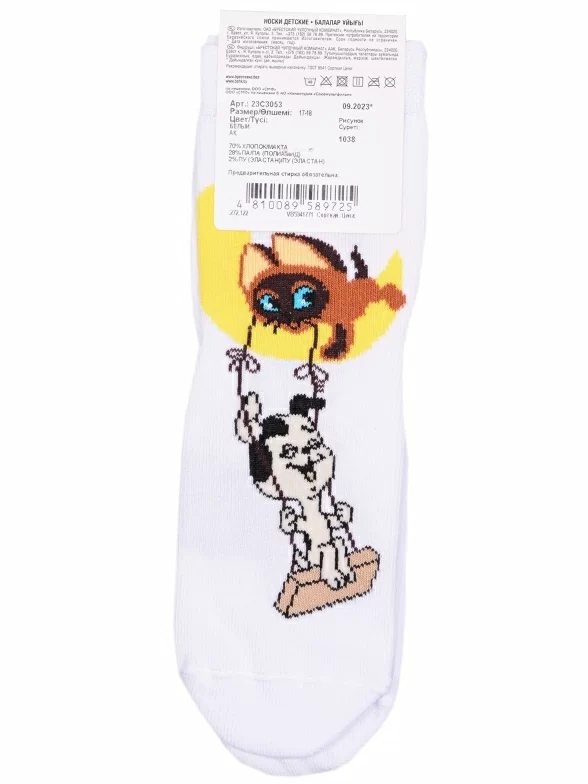 Круглогодичные укороченные детские носки, цвет белый, повседневные, шов кеттельный (бесшовная технология), принт (рисунок): фильмы / сериалы / мультики, животные, с узором, состав: 70% хлопок, 28% полиамид, 2% эластан, арт. 23С3053. Производитель «Брестский чулочный комбинат ОАО, Беларусь» под брендом «Брестские (бчк)».