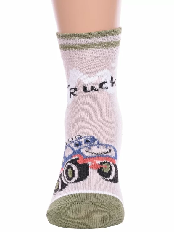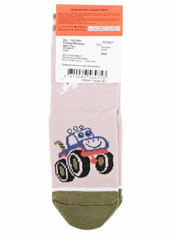 Круглогодичные укороченные детские носки, цвет бежевый, повседневные, возможно бесшовные, принт (рисунок): транспорт, надписи, контрастные пятка / мысок / резинка, с узором, состав: 75% хлопок, 23% полиамид, 2% эластан, арт. 14С3081. Производитель «Брестский чулочный комбинат ОАО, Беларусь» под брендом «Брестские (бчк)».