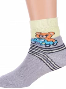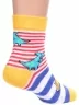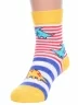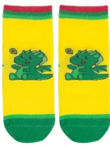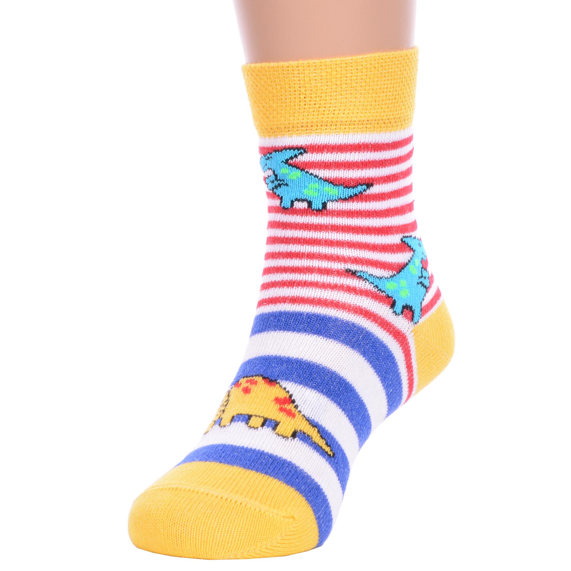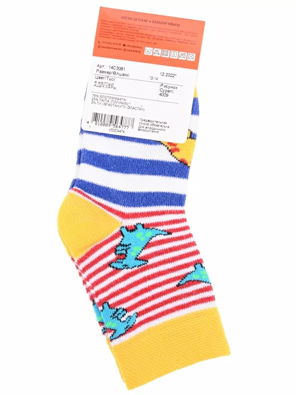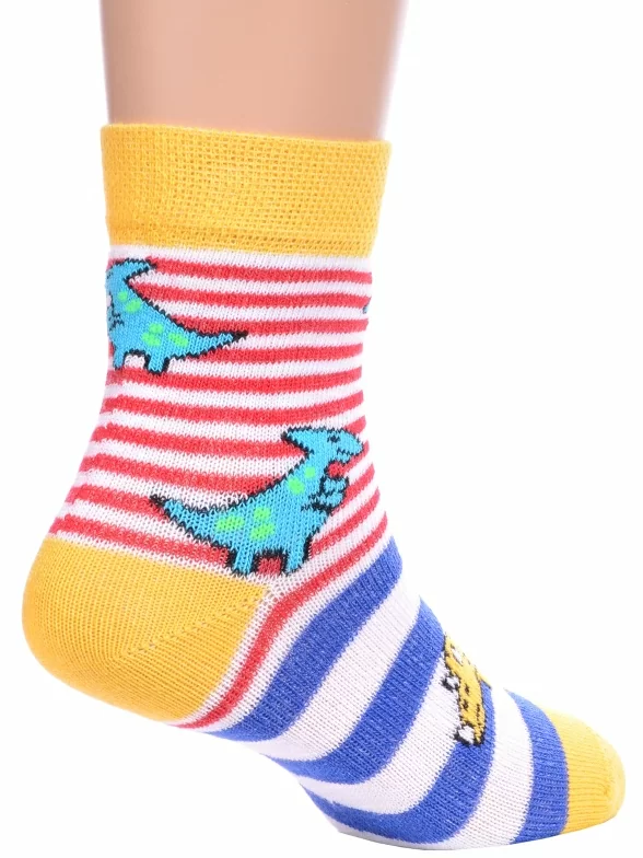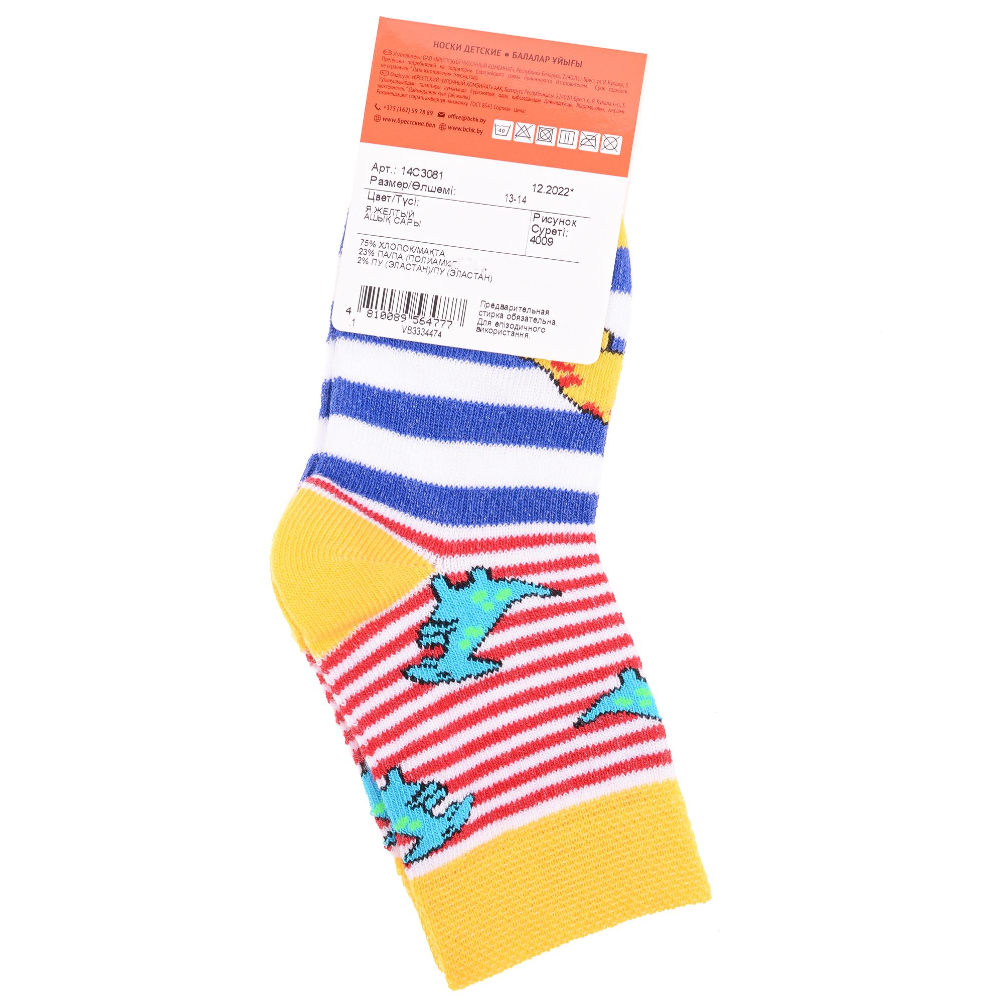 Круглогодичные укороченные детские носки, цвет желтый, повседневные, возможно бесшовные, принт (рисунок): полоски, контрастные пятка / мысок / резинка, животные, с узором, состав: 75% хлопок, 23% полиамид, 2% эластан, арт. 14С3081. Производитель «Брестский чулочный комбинат ОАО, Беларусь» под брендом «Брестские (бчк)».
