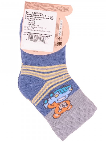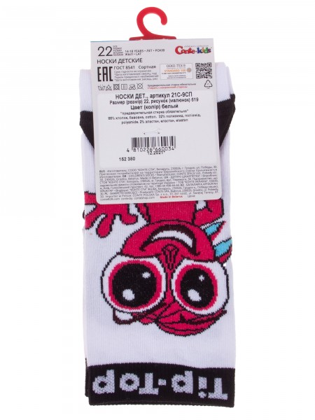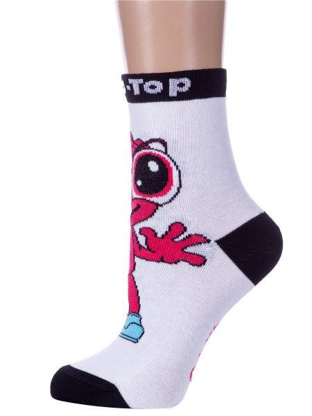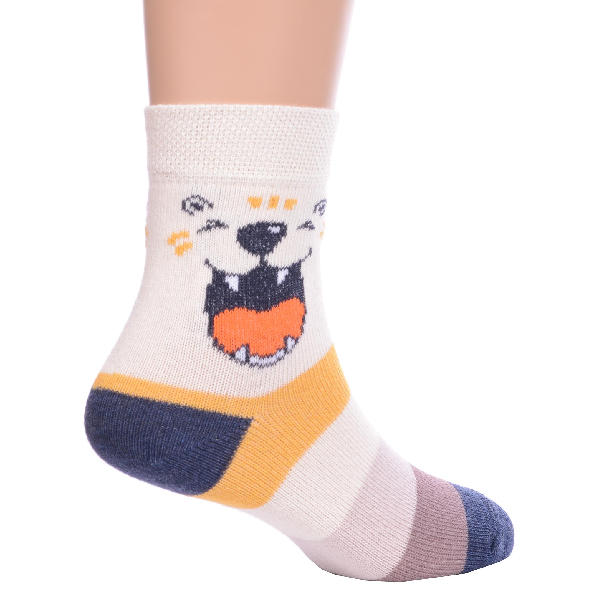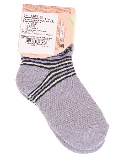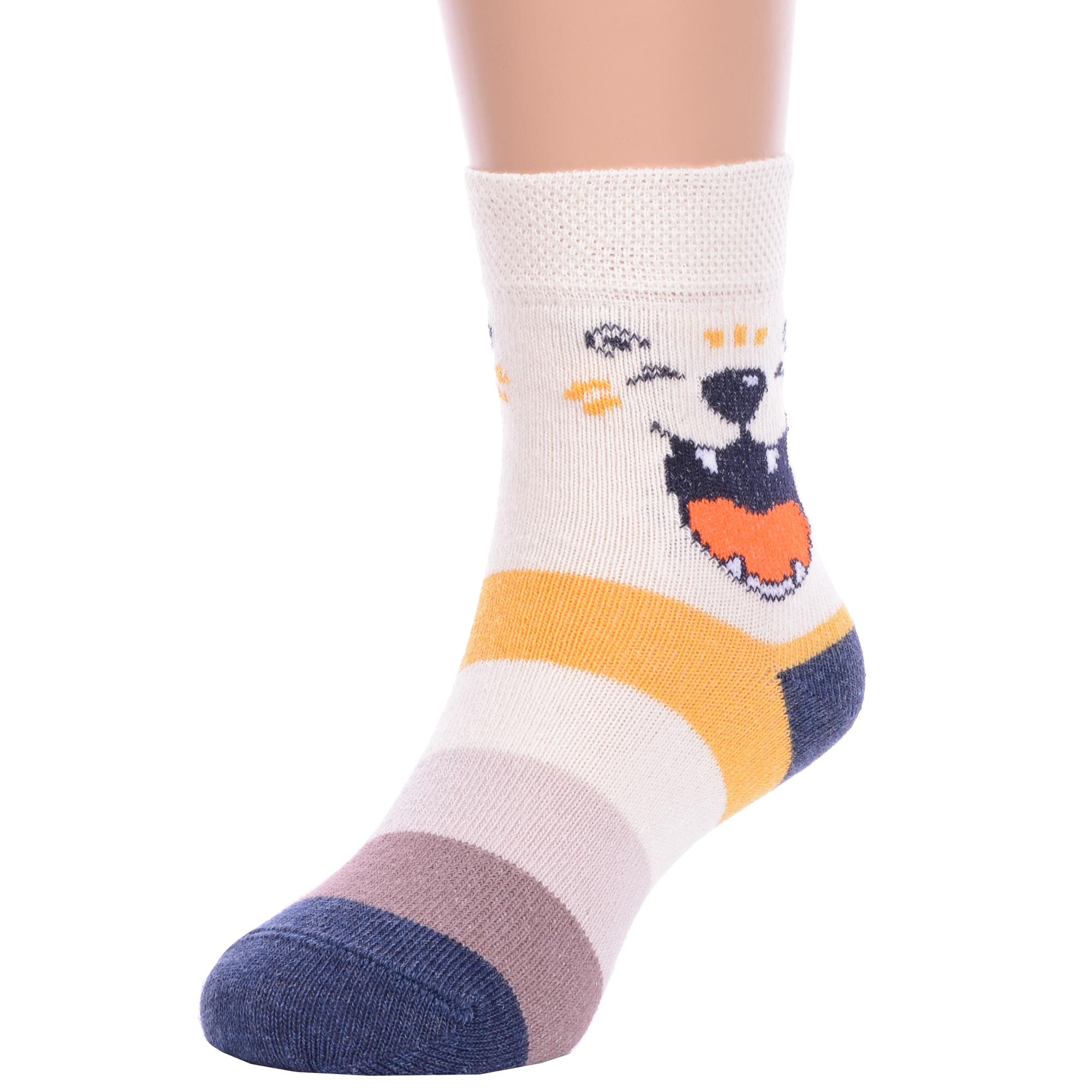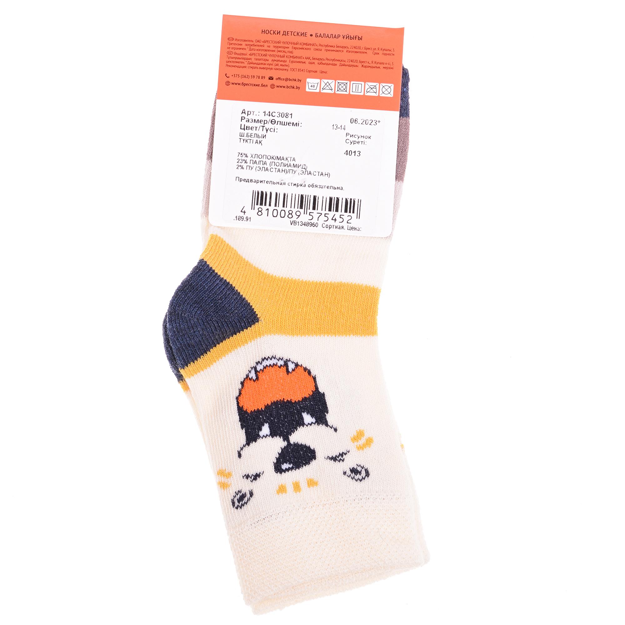 Круглогодичные укороченные детские носки, цвет белый, повседневные, возможно бесшовные, принт (рисунок): полоски, контрастные пятка/мысок/резинка, животные, с узором, состав: 75% хлопок, 23% полиамид, 2% эластан, арт. 14С3081. Производитель «Брестский чулочный комбинат ОАО, Беларусь» под брендом «Брестские (бчк)».