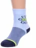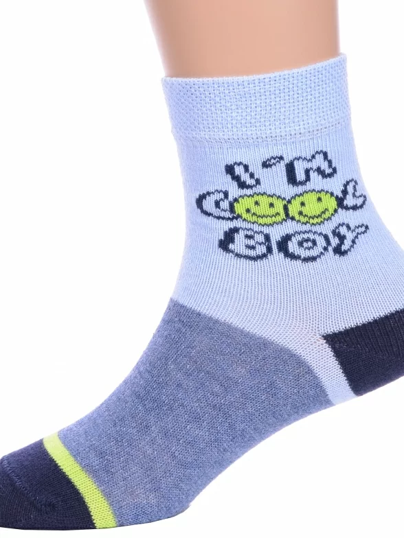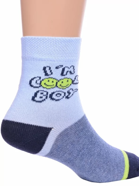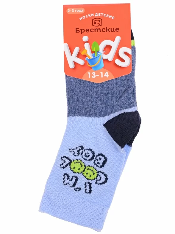 Круглогодичные укороченные детские носки, цвет голубой, повседневные, возможно бесшовные, принт (рисунок): надписи, контрастные пятка / мысок / резинка, с узором, состав: 75% хлопок, 23% полиамид, 2% эластан, арт. 14С3081. Производитель «Брестский чулочный комбинат ОАО, Беларусь» под брендом «Брестские (бчк)».