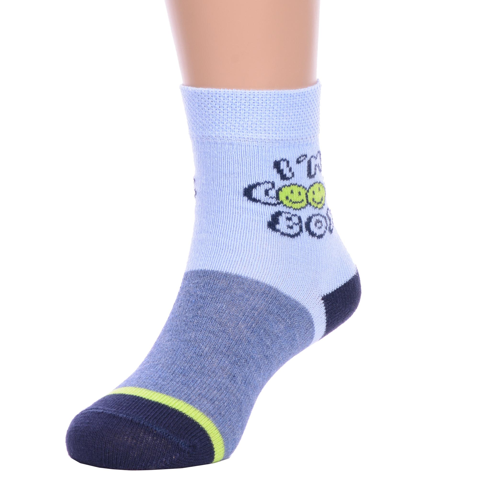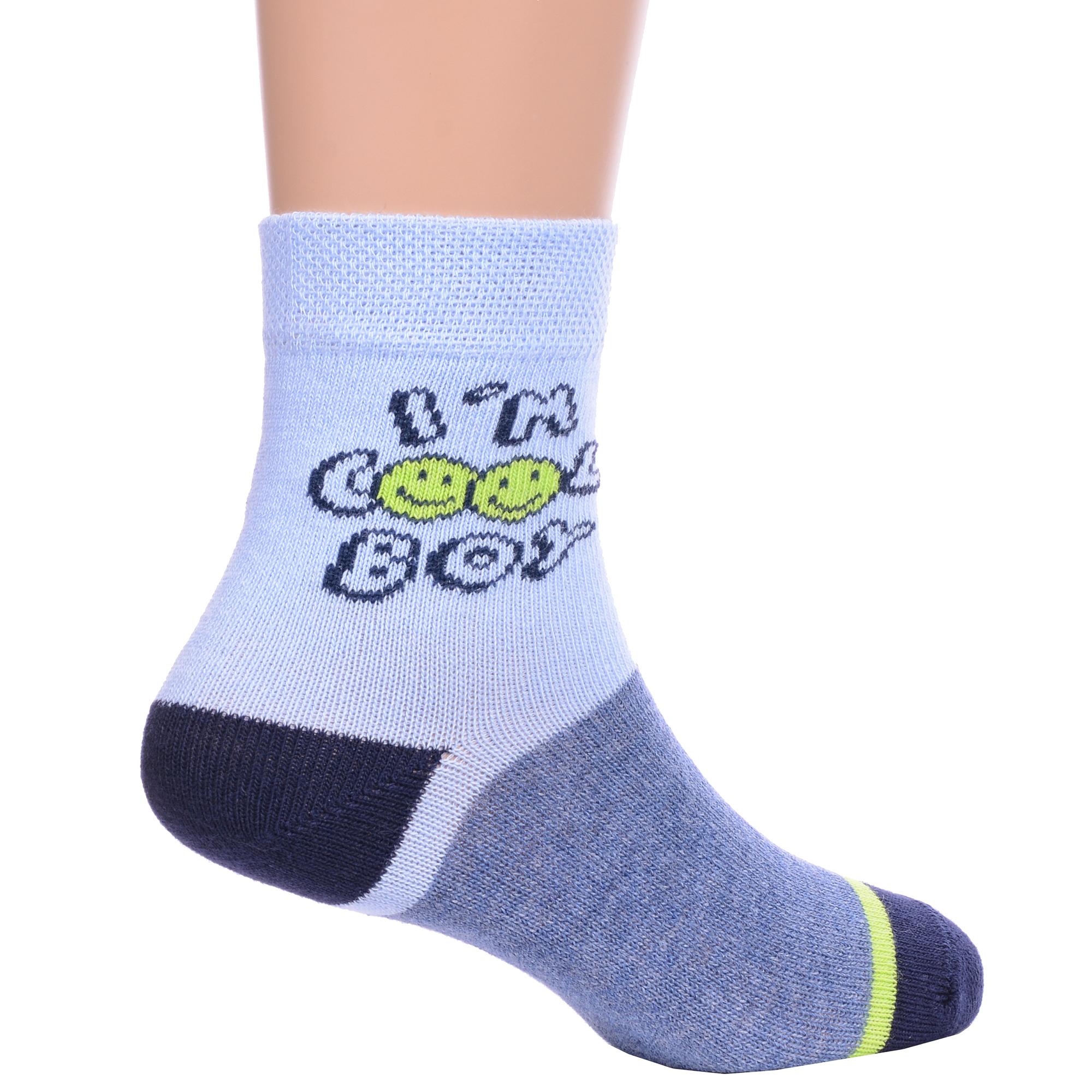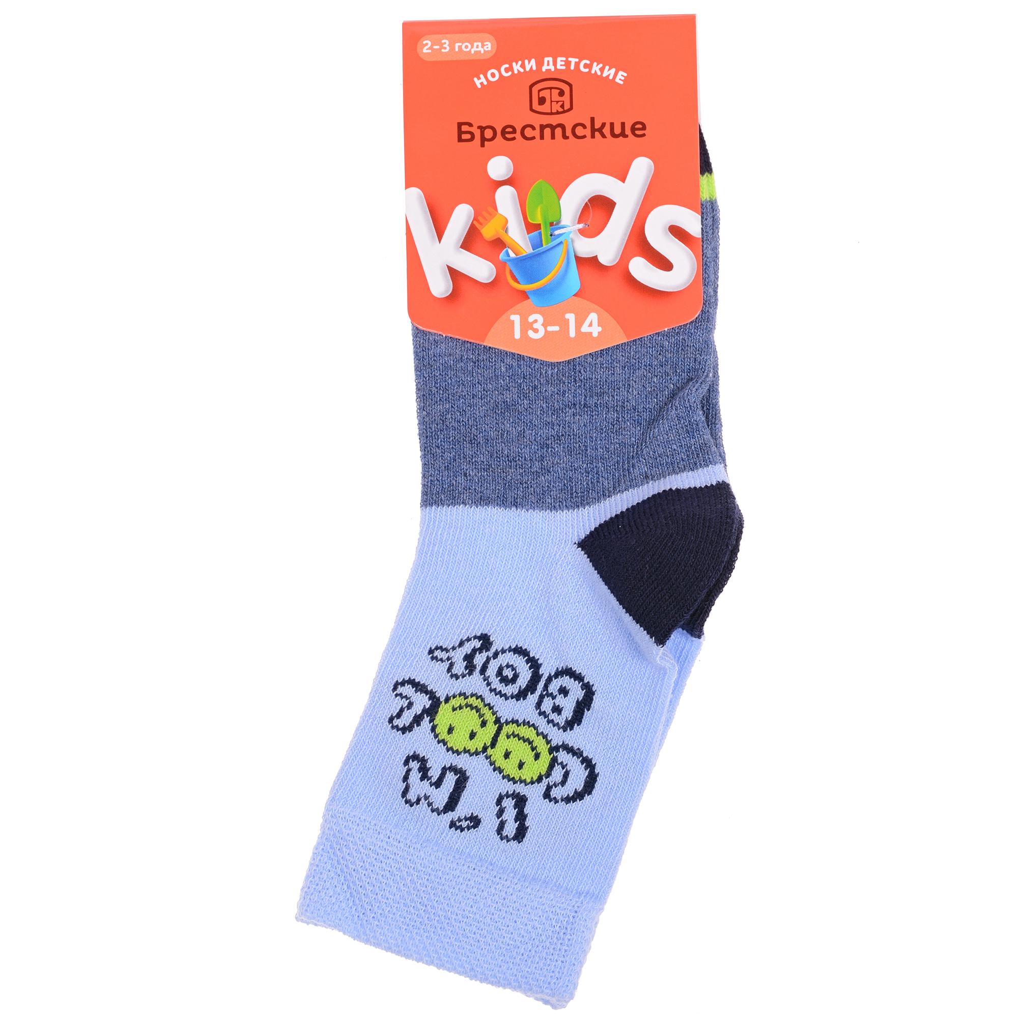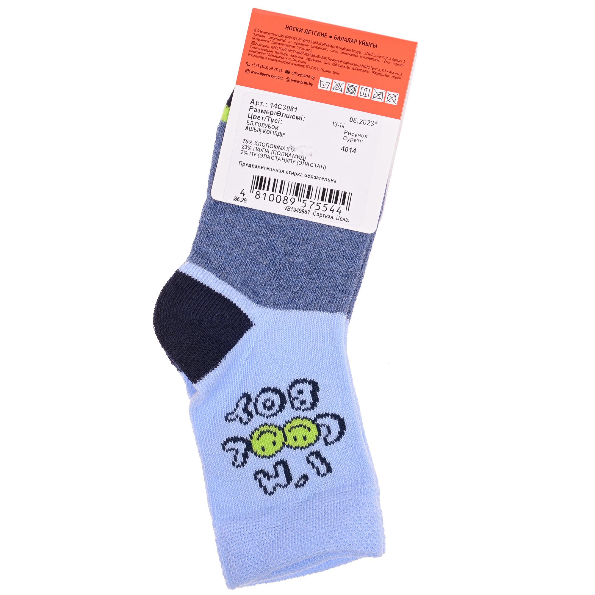 Круглогодичные укороченные детские носки, цвет голубой, повседневные, возможно бесшовные, принт (рисунок): надписи, контрастные пятка/мысок/резинка, с узором, состав: 75% хлопок, 23% полиамид, 2% эластан, арт. 14С3081. Производитель «Брестский чулочный комбинат ОАО, Беларусь» под брендом «Брестские (бчк)».