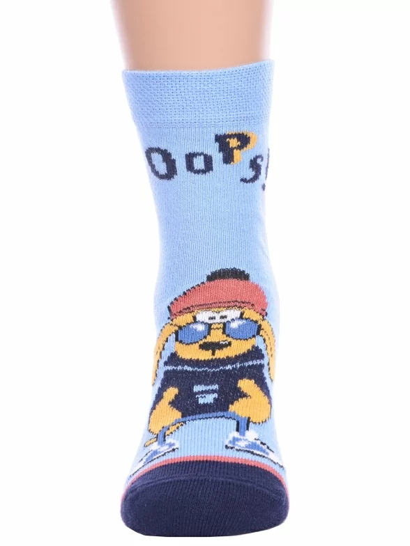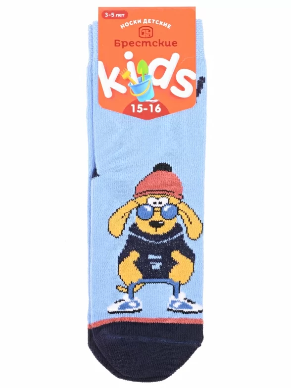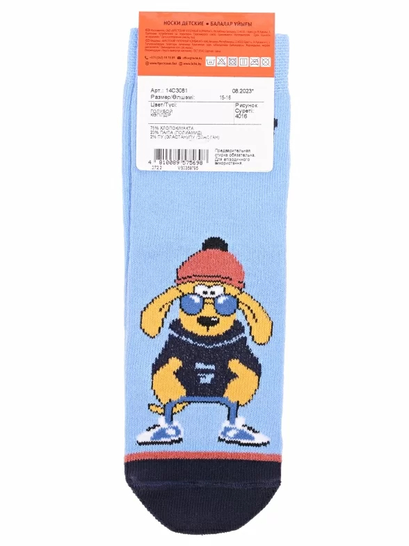Круглогодичные укороченные детские носки, цвет голубой, повседневные, возможно бесшовные, принт (рисунок): надписи, контрастные пятка / мысок / резинка, животные, с узором, крупные контрастные рисунки, состав: 75% хлопок, 23% полиамид, 2% эластан, арт. 14С3081. Производитель «Брестский чулочный комбинат ОАО, Беларусь» под брендом «Брестские (бчк)».