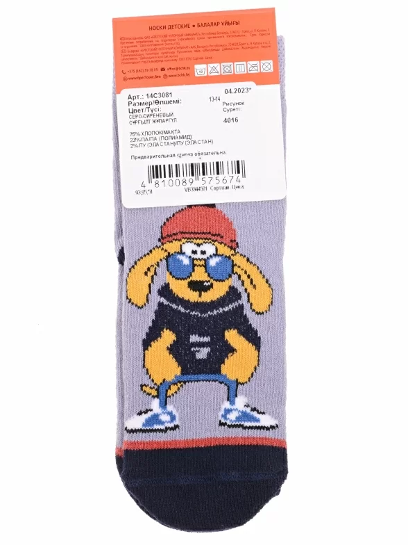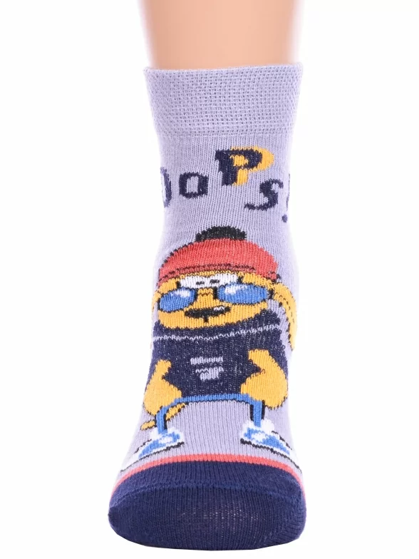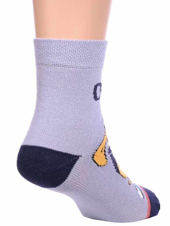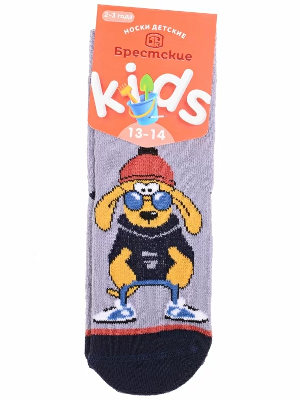 Круглогодичные укороченные детские носки, цвет сиреневый, повседневные, возможно бесшовные, принт (рисунок): надписи, контрастные пятка / мысок / резинка, животные, с узором, крупные контрастные рисунки, состав: 75% хлопок, 23% полиамид, 2% эластан, арт. 14С3081. Производитель «Брестский чулочный комбинат ОАО, Беларусь» под брендом «Брестские (бчк)».