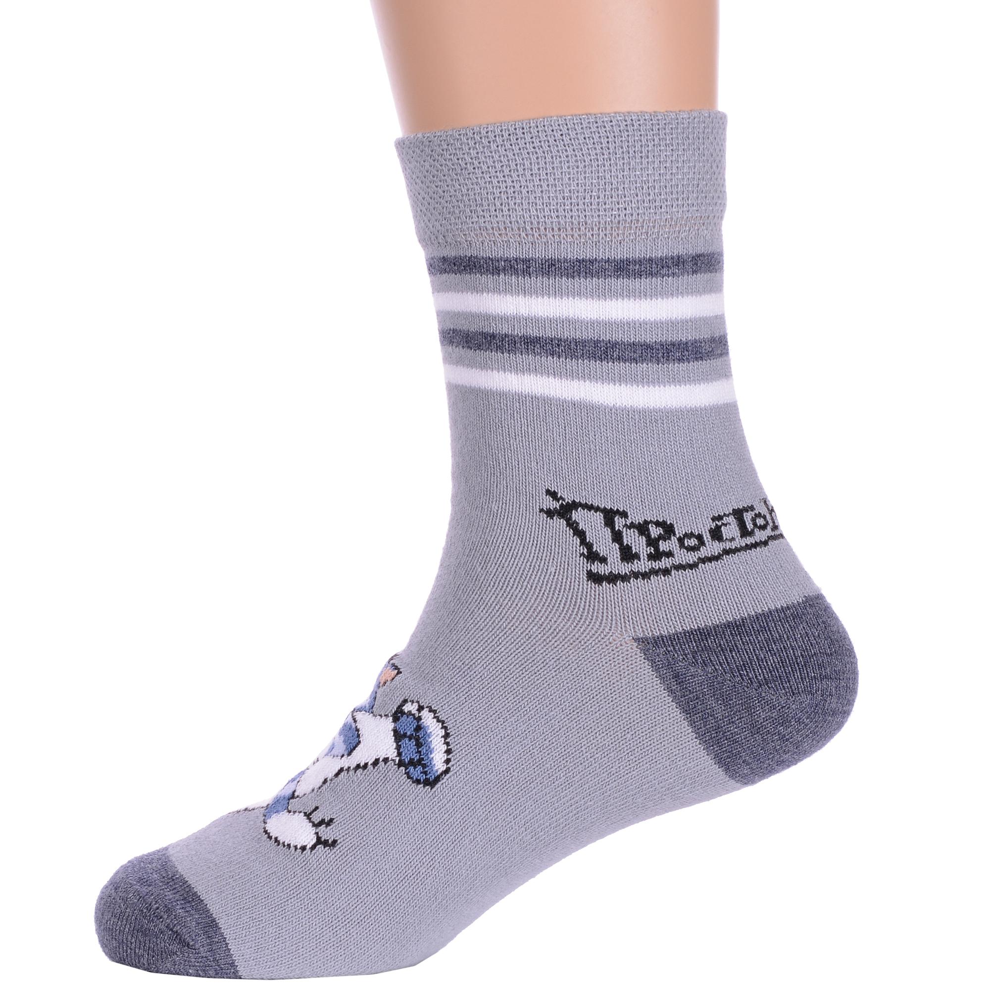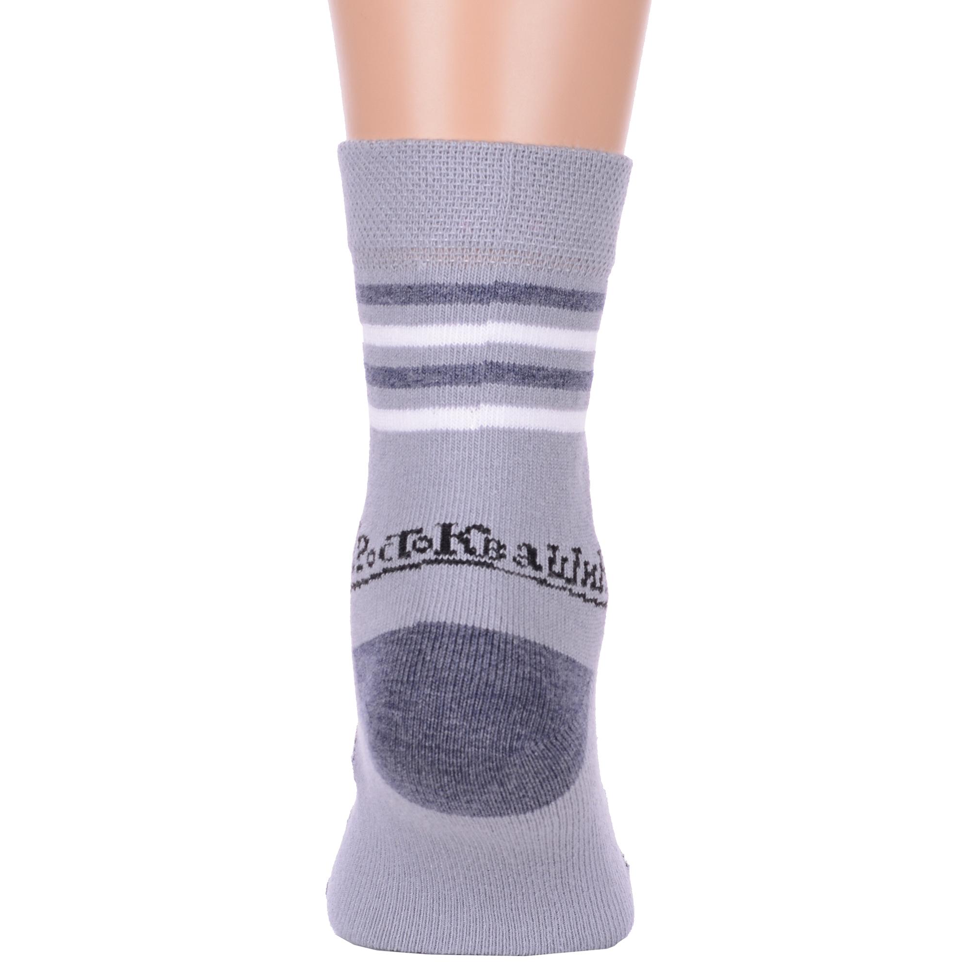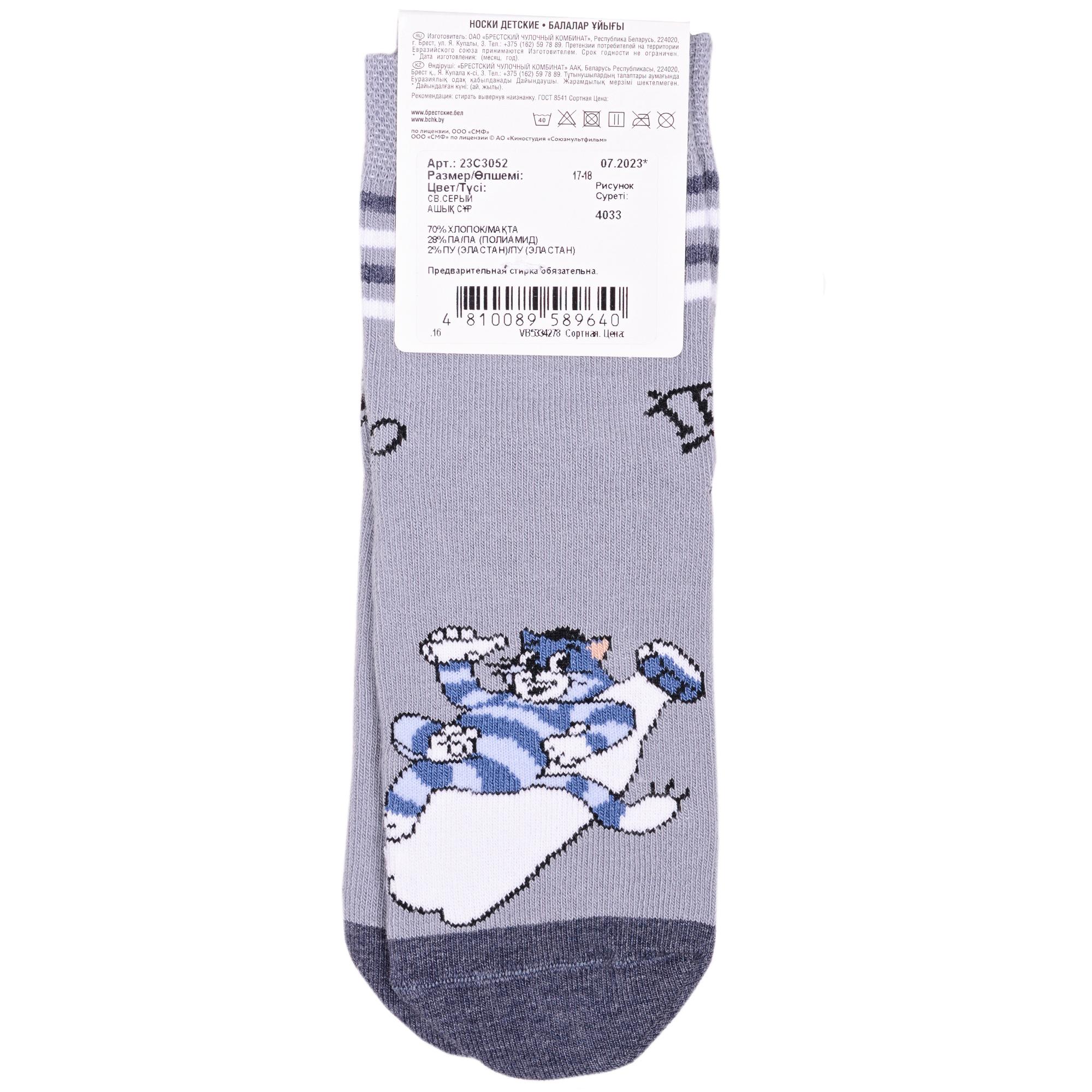 Круглогодичные укороченные детские носки, цвет светло-серый, повседневные, шов кеттельный (бесшовная технология), принт (рисунок): фильмы / сериалы / мультики, полоски, надписи, контрастные пятка / мысок / резинка, животные, с узором, состав: 70% хлопок, 28% полиамид, 2% эластан, арт. 23С3052. Производитель «Брестский чулочный комбинат ОАО, Беларусь» под брендом «Брестские (бчк)».