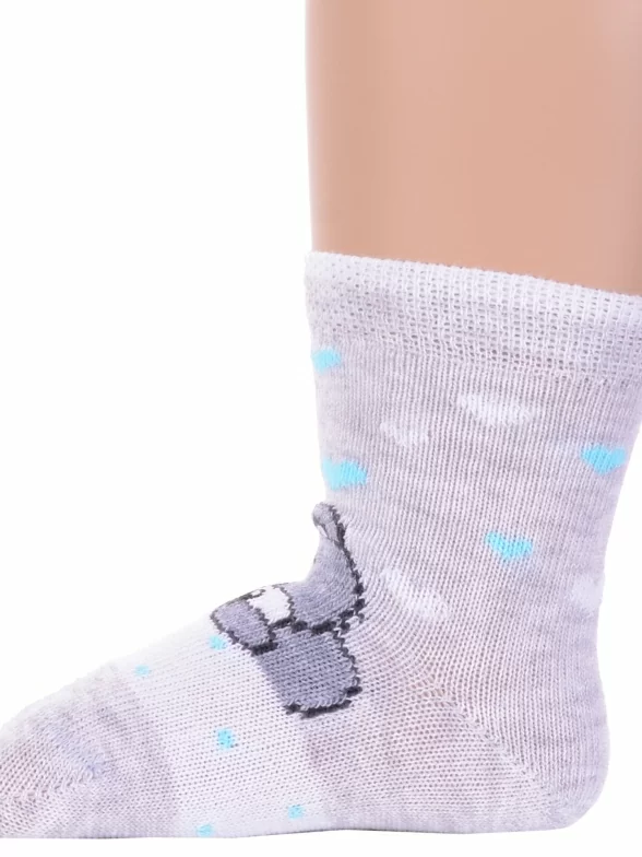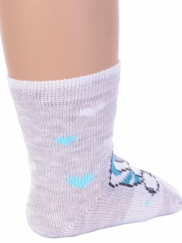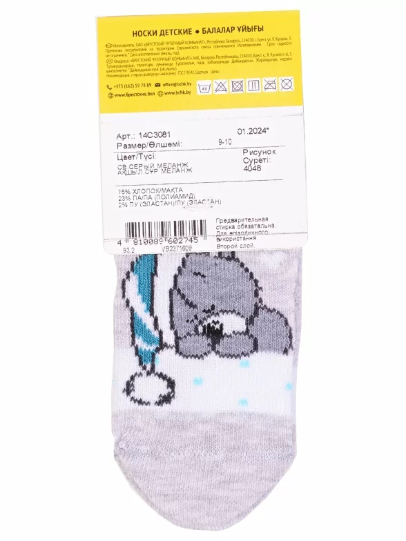 Круглогодичные укороченные детские носки, цвет светло-серый, повседневные, возможно бесшовные, принт (рисунок): сердечки / поцелуи / любовь, животные, с узором, крупные контрастные рисунки, состав: 75% хлопок, 23% полиамид, 2% эластан, арт. 14С3081. Производитель «Брестский чулочный комбинат ОАО, Беларусь» под брендом «Брестские (бчк)».