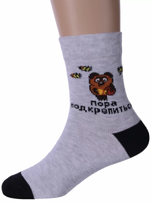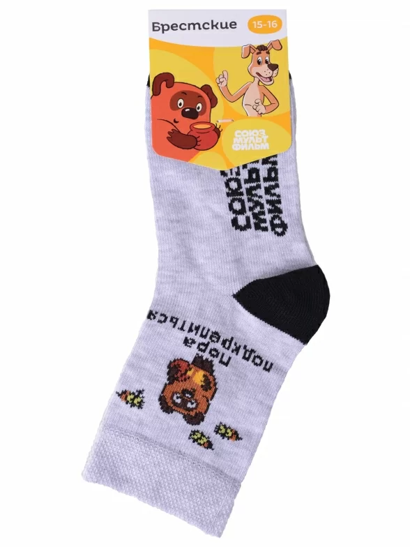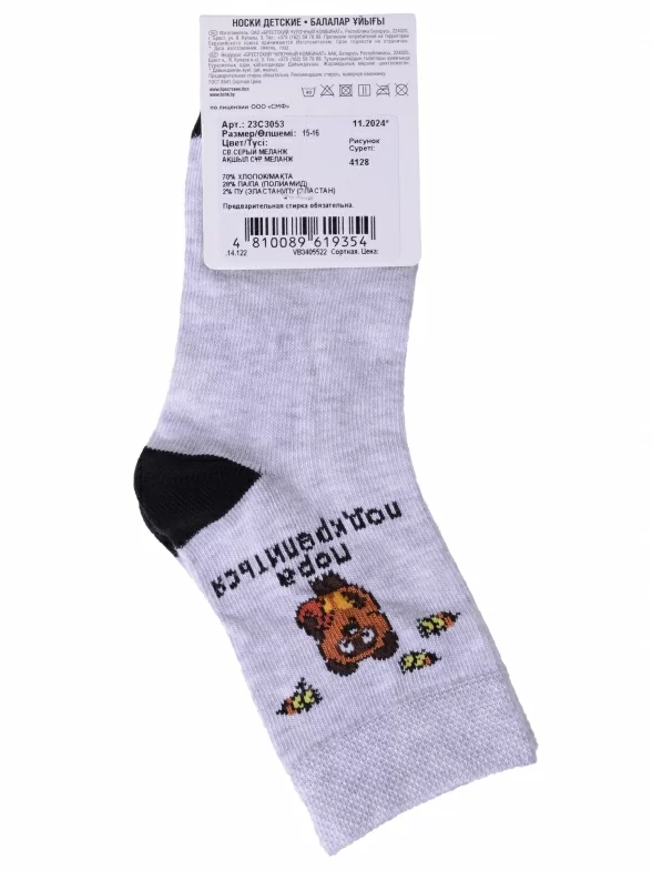 Круглогодичные укороченные детские носки, цвет светло-серый, разного цвета, шов плоский, принт (рисунок): животные, состав: 70% хлопок, 28% полиамид, 2% эластан, арт. 23С3053. Производитель «Брестский чулочный комбинат ОАО, Беларусь» под брендом «Брестские (бчк)».