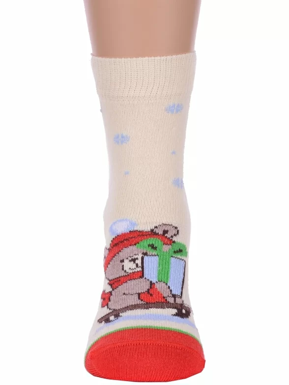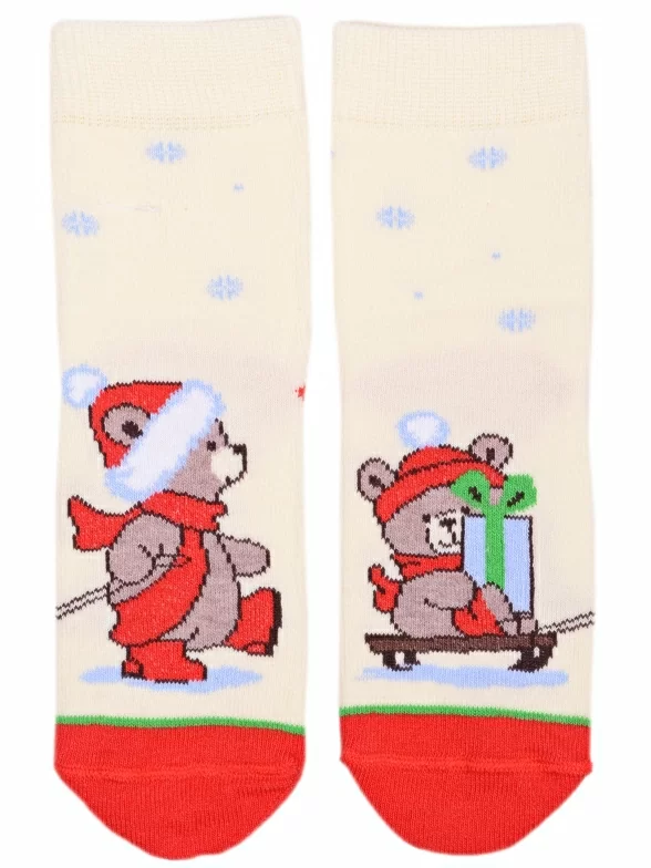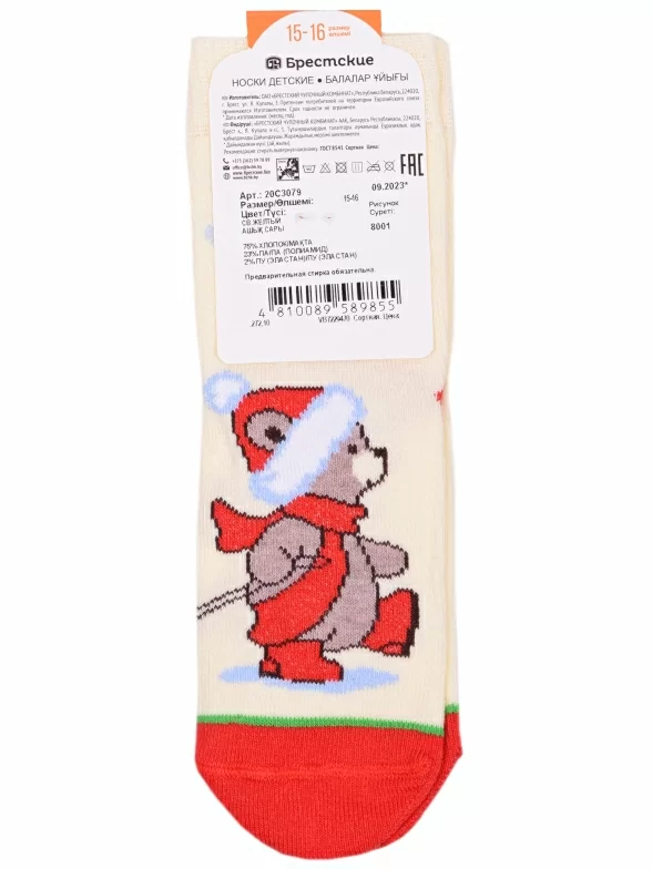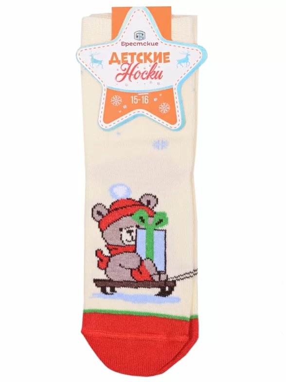 Круглогодичные укороченные детские носки, цвет желтый, повседневные, шов кеттельный (бесшовная технология), принт (рисунок): новый год, контрастные пятка / мысок / резинка, зимний, животные, с узором, крупные контрастные рисунки, состав: 75% хлопок, 23% полиамид, 2% эластан, арт. 20С3079. Производитель «Брестский чулочный комбинат ОАО, Беларусь» под брендом «Брестские (бчк)».