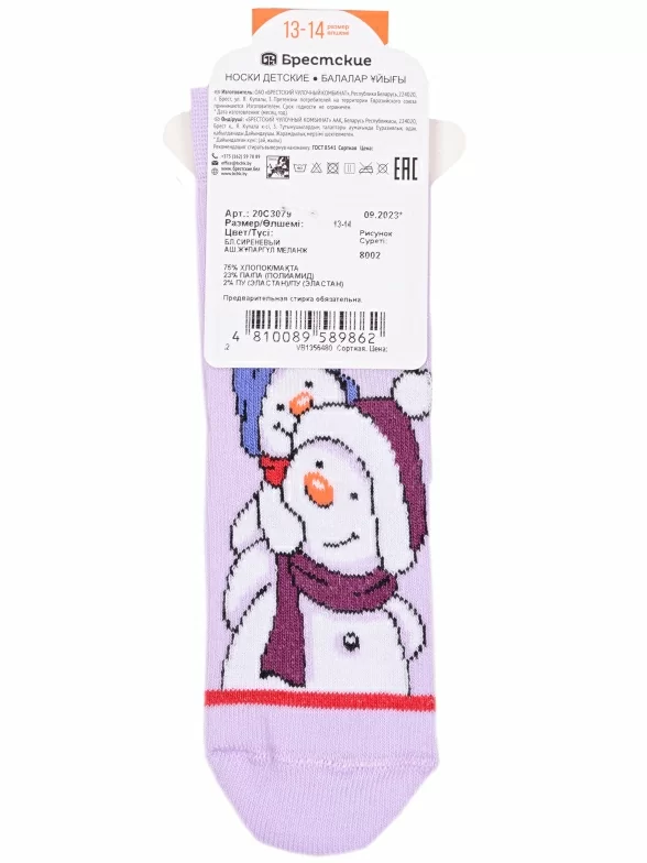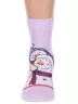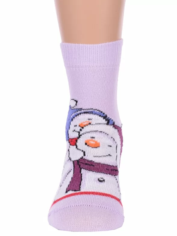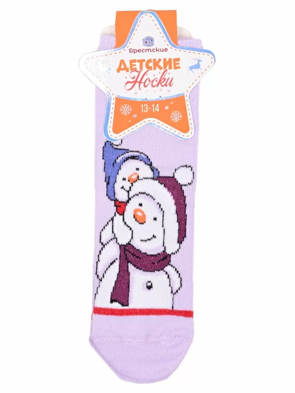Круглогодичные укороченные детские носки, цвет сиреневый, повседневные, шов кеттельный (бесшовная технология), принт (рисунок): новый год, зимний, с узором, крупные контрастные рисунки, состав: 75% хлопок, 23% полиамид, 2% эластан, арт. 20С3079. Производитель «Брестский чулочный комбинат ОАО, Беларусь» под брендом «Брестские (бчк)».