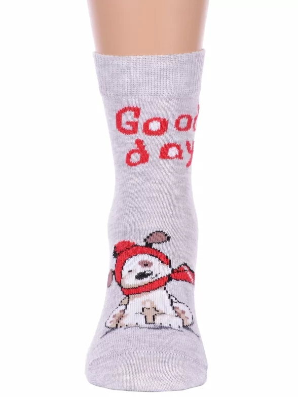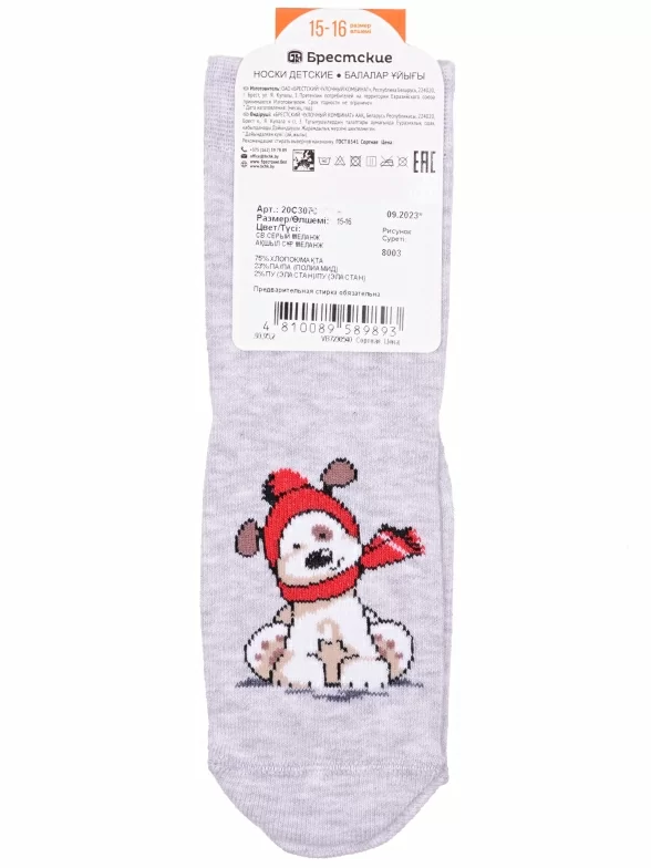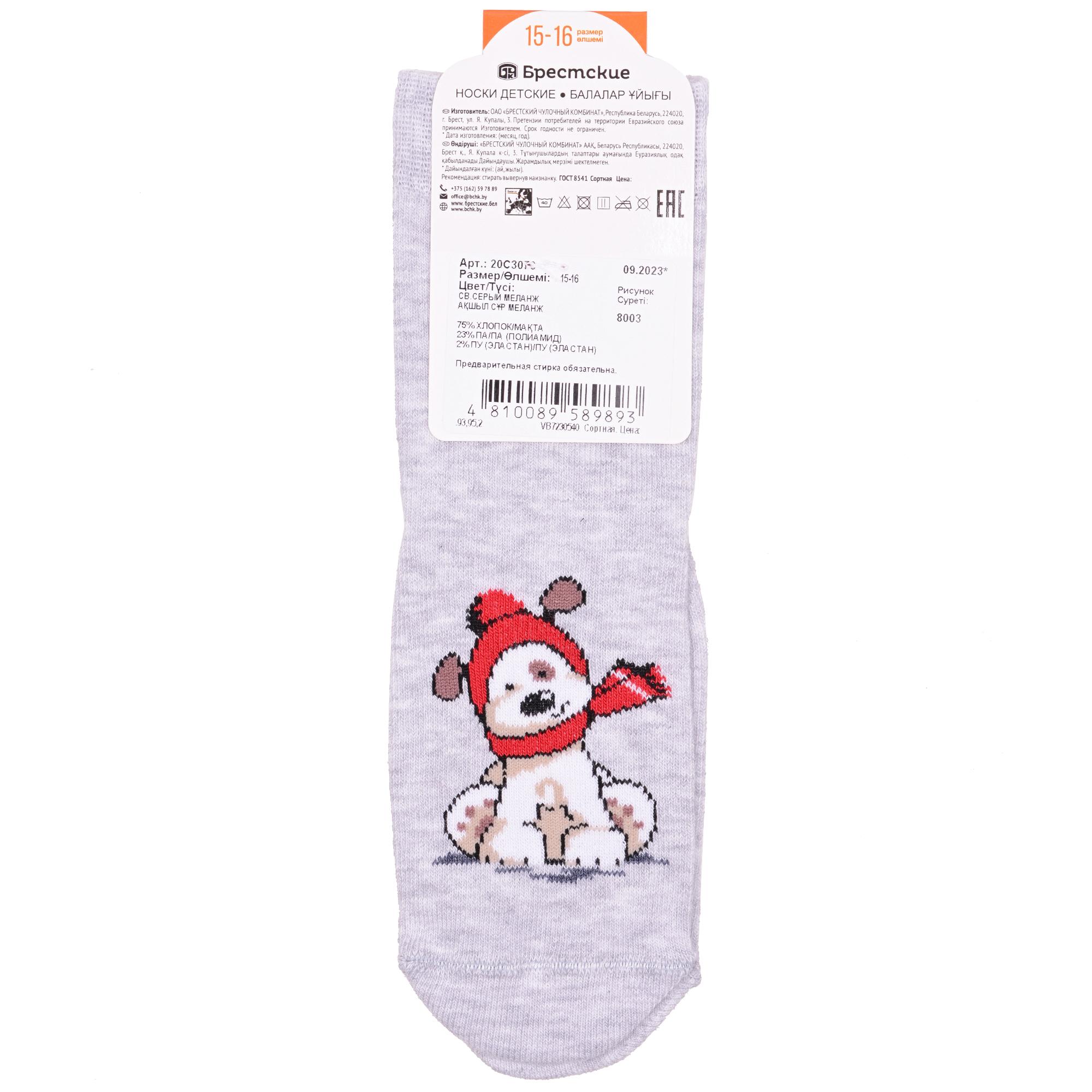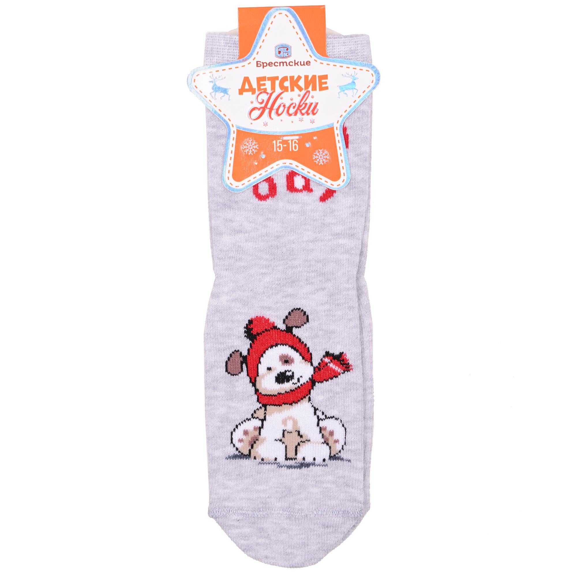 Круглогодичные укороченные детские носки, цвет светло-серый, повседневные, шов кеттельный (бесшовная технология), принт (рисунок): новый год, надписи, зимний, животные, с узором, крупные контрастные рисунки, состав: 75% хлопок, 23% полиамид, 2% эластан, арт. 20С3079. Производитель «Брестский чулочный комбинат ОАО, Беларусь» под брендом «Брестские (бчк)».
