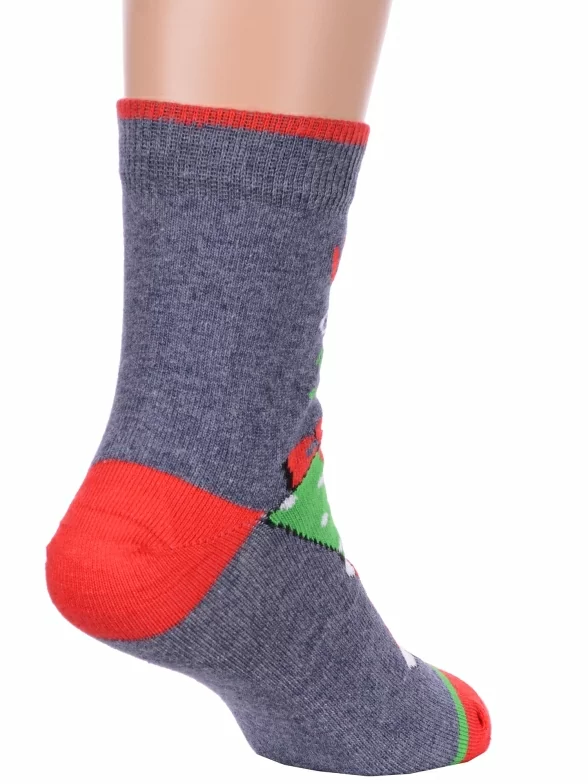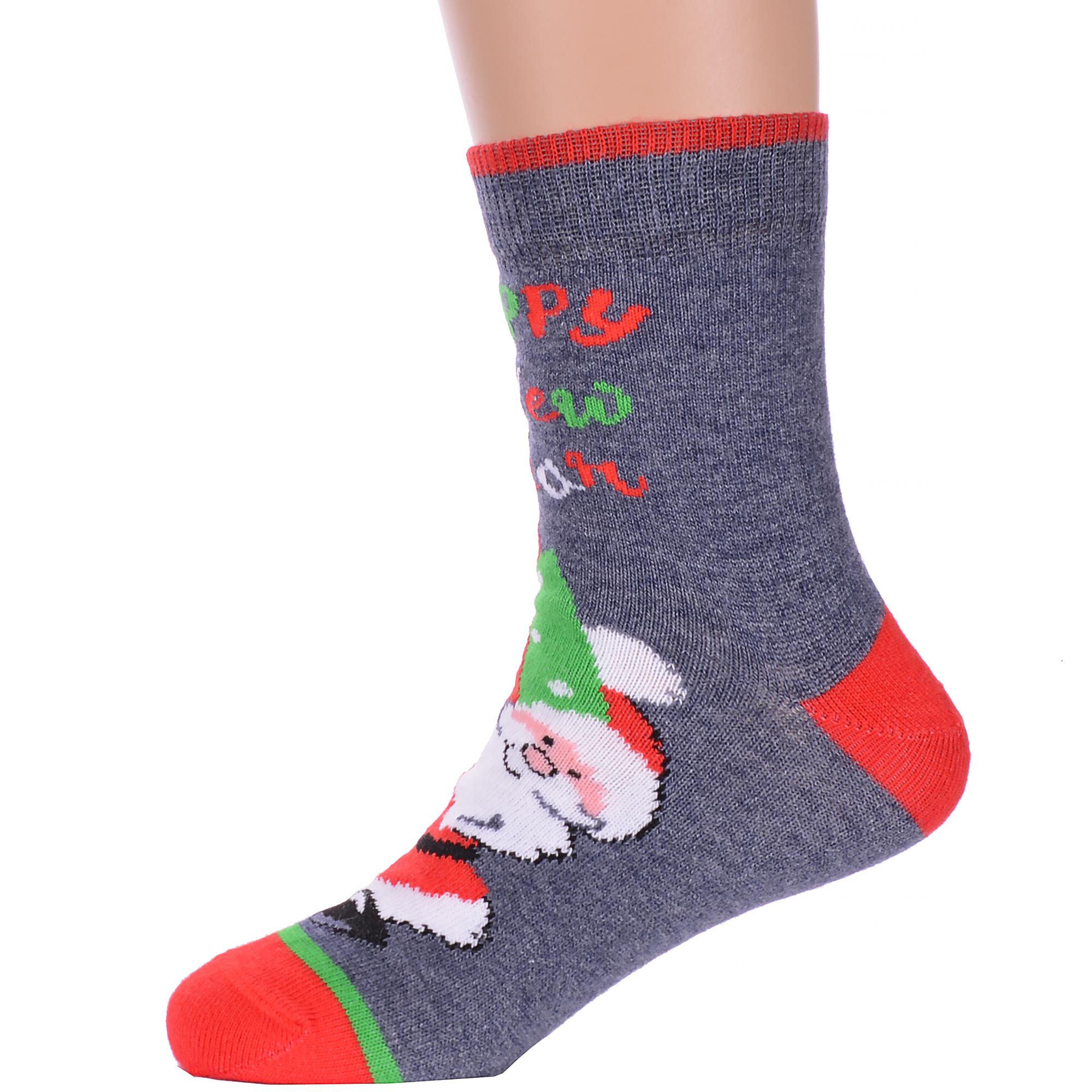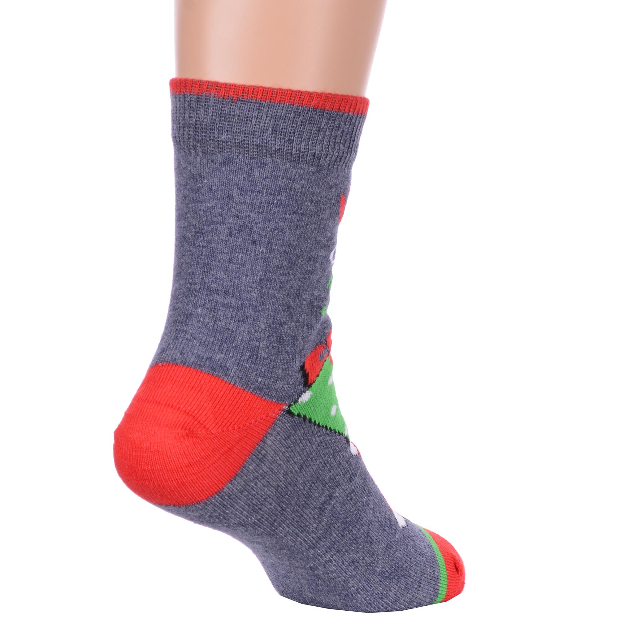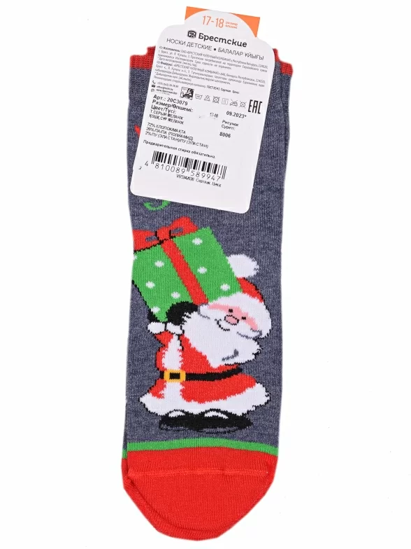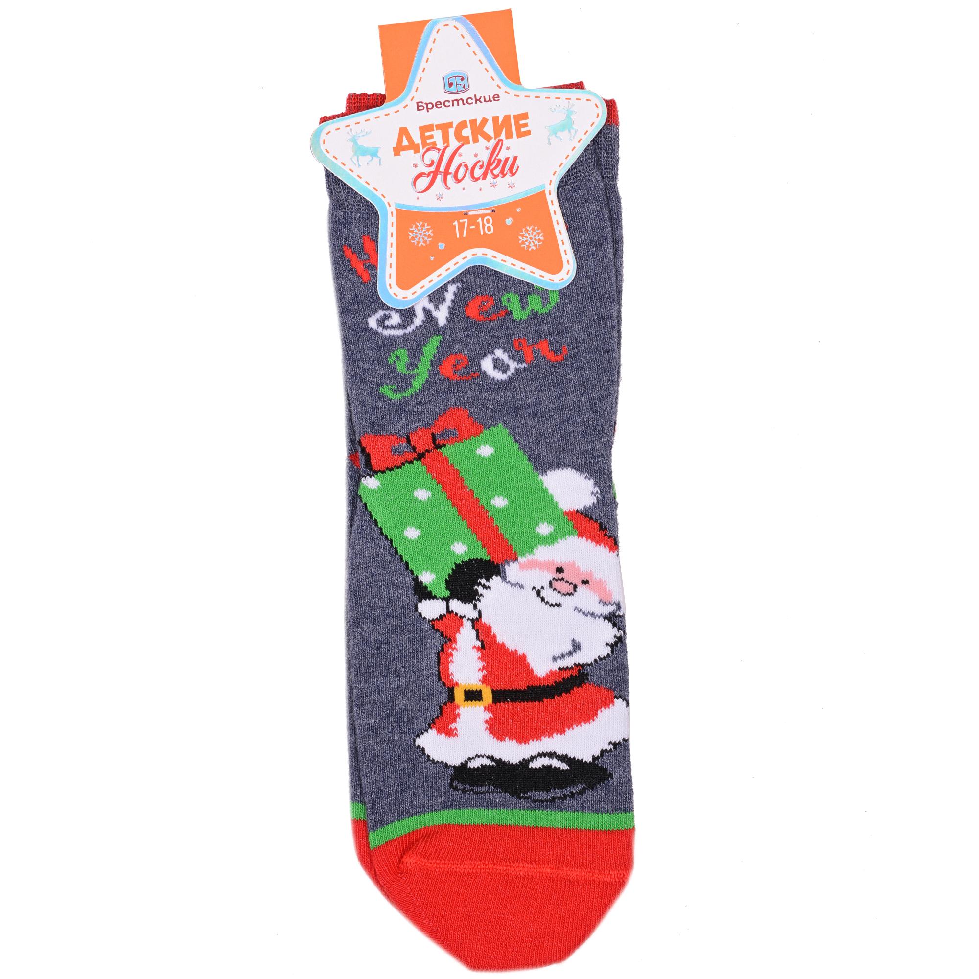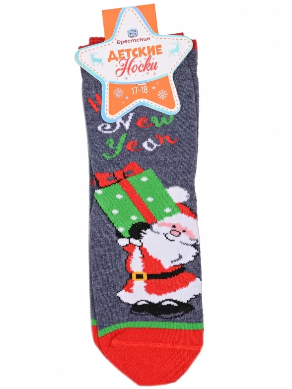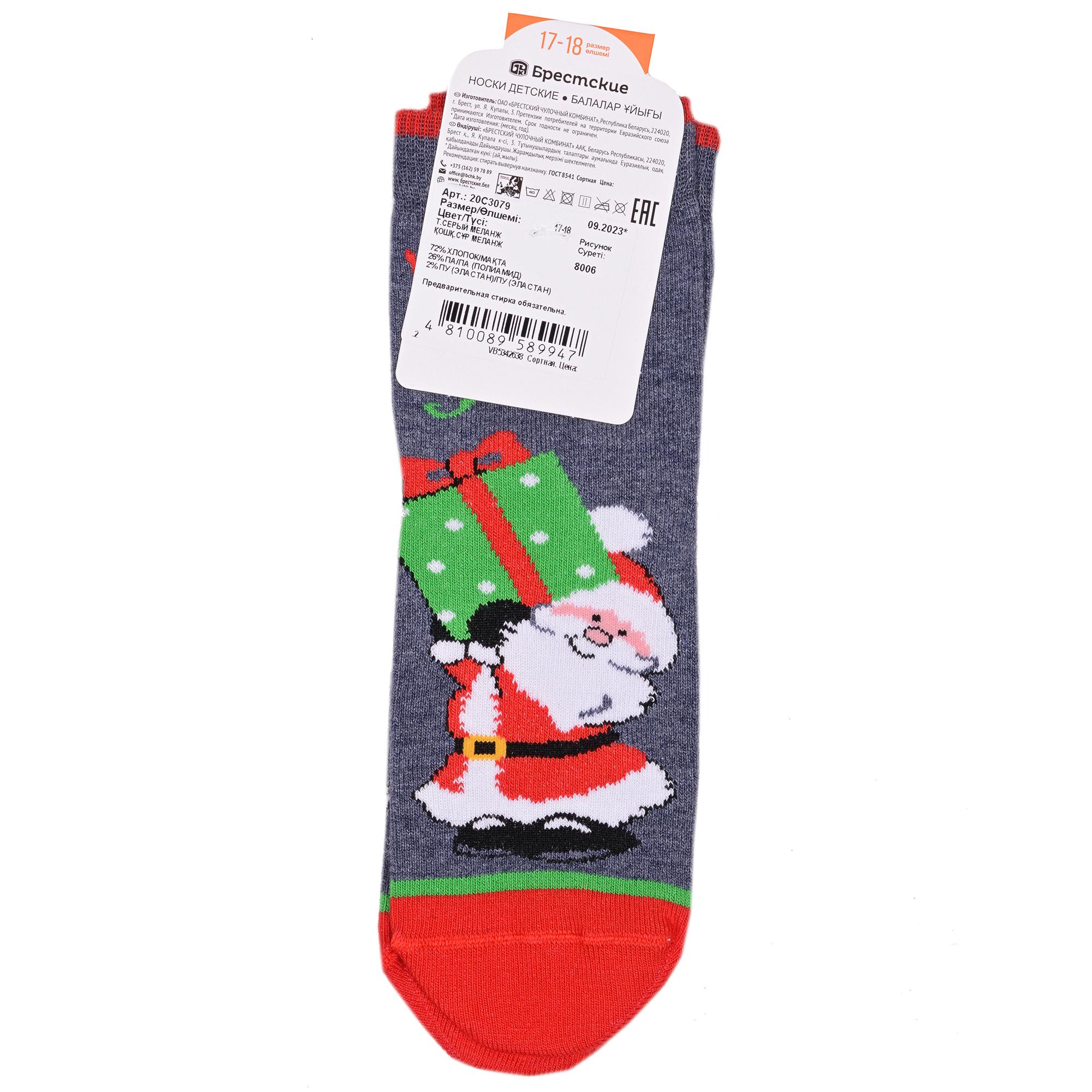 Круглогодичные укороченные детские носки, цвет темно-серый, повседневные, шов кеттельный (бесшовная технология), принт (рисунок): новый год, надписи, контрастные пятка / мысок / резинка, с узором, крупные контрастные рисунки, состав: 72% хлопок, 26% полиамид, 2% эластан, арт. 20С3079. Производитель «Брестский чулочный комбинат ОАО, Беларусь» под брендом «Брестские (бчк)».
