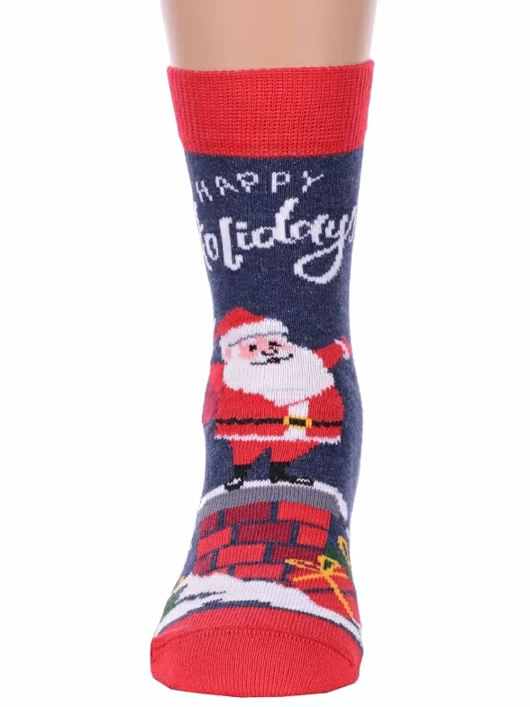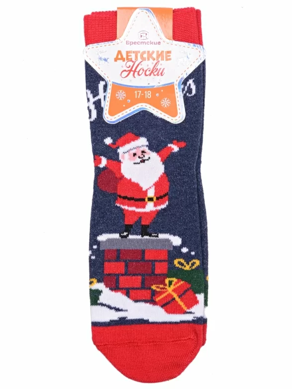 Круглогодичные укороченные детские носки, цвет темно-синий, повседневные, шов кеттельный (бесшовная технология), принт (рисунок): новый год, надписи, контрастные пятка / мысок / резинка, с узором, крупные контрастные рисунки, состав: 72% хлопок, 26% полиамид, 2% эластан, арт. 20С3079. Производитель «Брестский чулочный комбинат ОАО, Беларусь» под брендом «Брестские (бчк)».