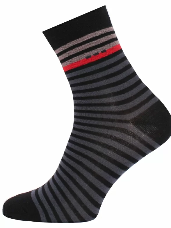 Детские носки связаны из пряжи трех цветов, образующих полоски. Нить изготовлена из хлопка с добавлением полиамида и эластана.