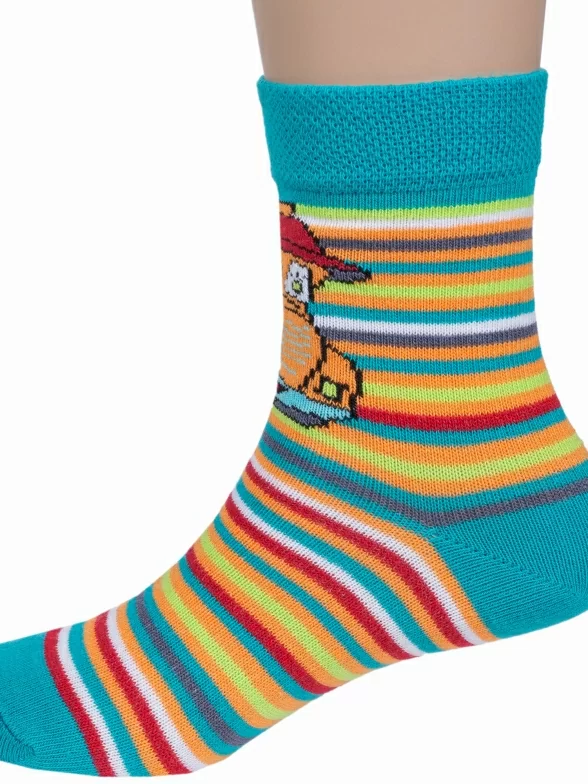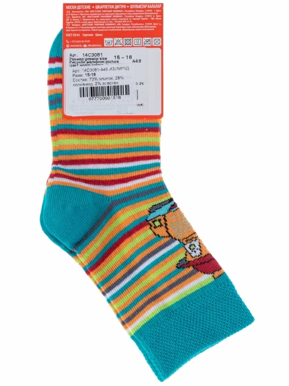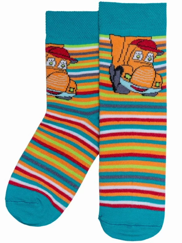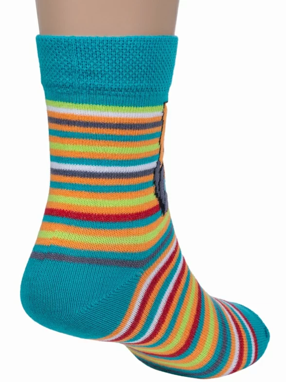 Стильный детские носки в яркую полоску, дополненную милой мультяшной машинкой. Высокая мягкая резинка отлично фиксирует их на ноге, не передавливая кожу. Носки сделаны из мягкого материала на основе хлопка.