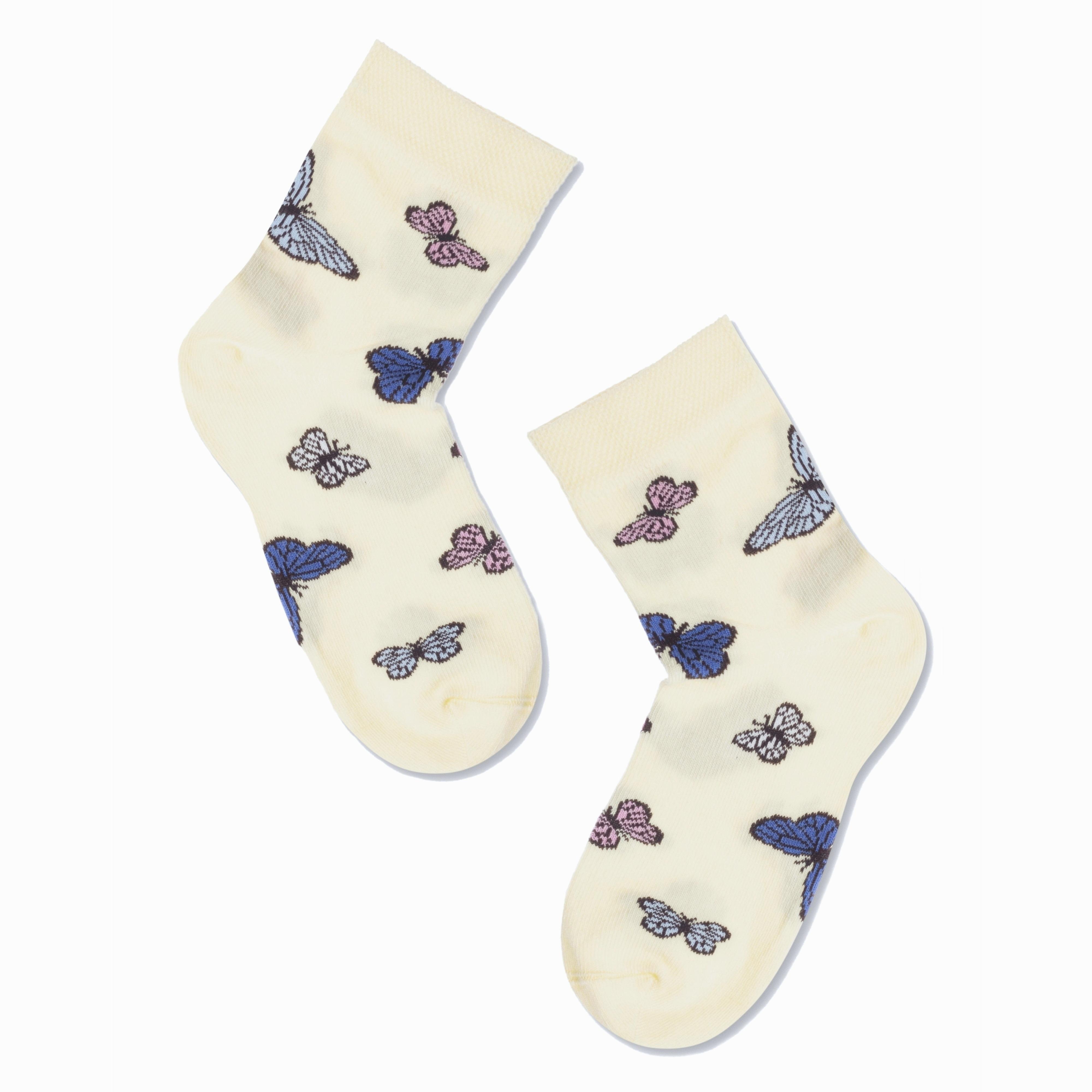 Круглогодичные укороченные детские носки, цвет желтый, повседневные, шов обычный (не бесшовные), принт (рисунок): с узором, крупные контрастные рисунки, состав: 70% хлопок, 28% полиамид, 2% эластан, арт. 14С3081. Производитель «Брестский чулочный комбинат ОАО, Беларусь» под брендом «Брестские (бчк)».