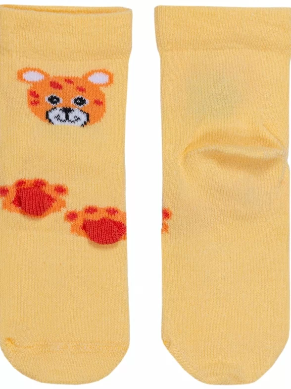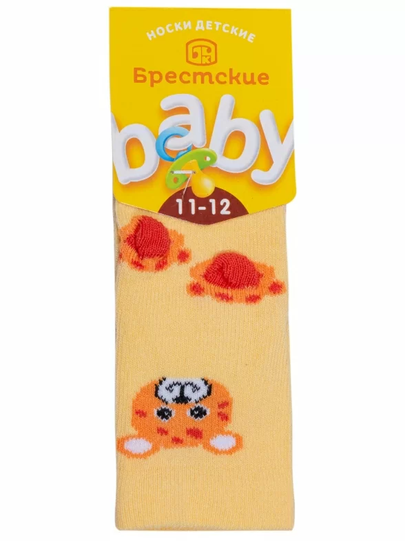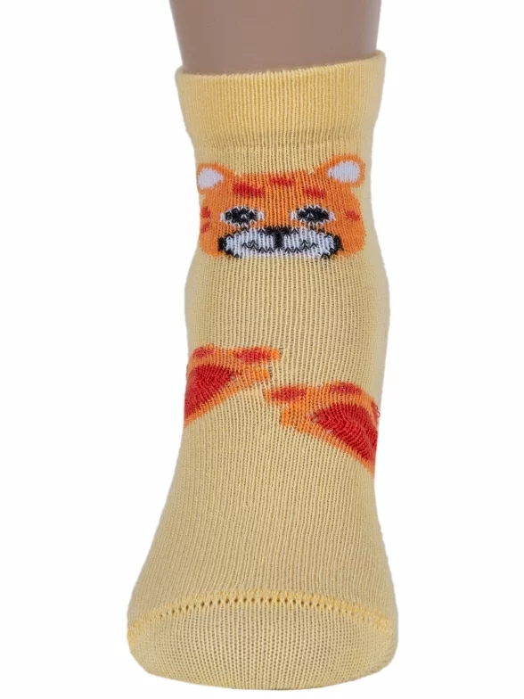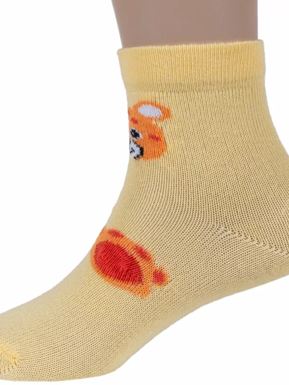 Круглогодичные укороченные детские носки, цвет желтый, повседневные, шов обычный (не бесшовные), принт (рисунок): животные, с узором, крупные контрастные рисунки, состав: 75% хлопок, 23% полиамид, 2% эластан, арт. 18С3086. Производитель «Брестский чулочный комбинат ОАО, Беларусь» под брендом «Брестские (бчк)».