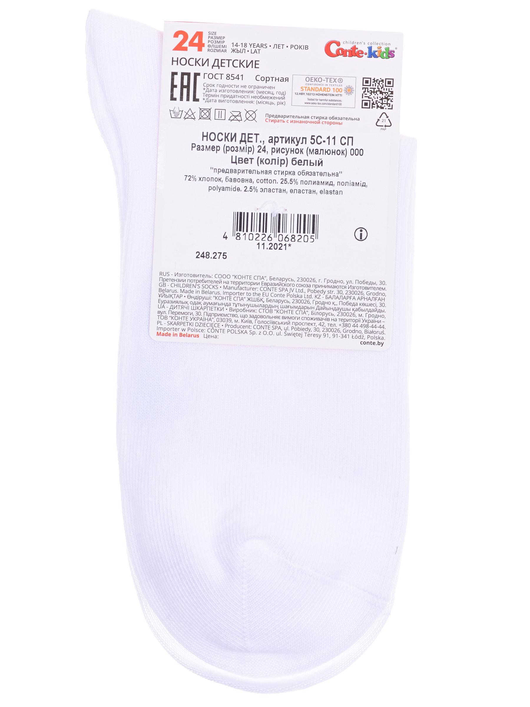 Круглогодичные укороченные детские носки, цвет белый, классические, возможно бесшовные, принт (рисунок): однотонный, без рисунков/узоров, состав: 72% хлопок, 25.5% полиамид, 2.5% эластан, арт. 5С-11СП. Производитель «Conte, Беларусь» под брендом «Conte».