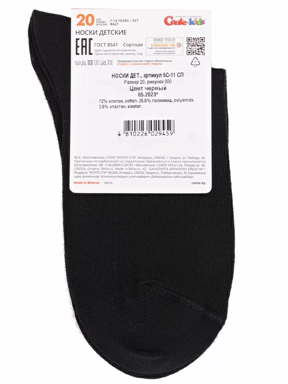Круглогодичные укороченные детские носки, цвет черный, классические, состав: 72% хлопок, 25.5% полиамид, 2.5% эластан, фабричный артикул 5С-11СП. Производитель «Conte, Беларусь» под брендом «Conte».