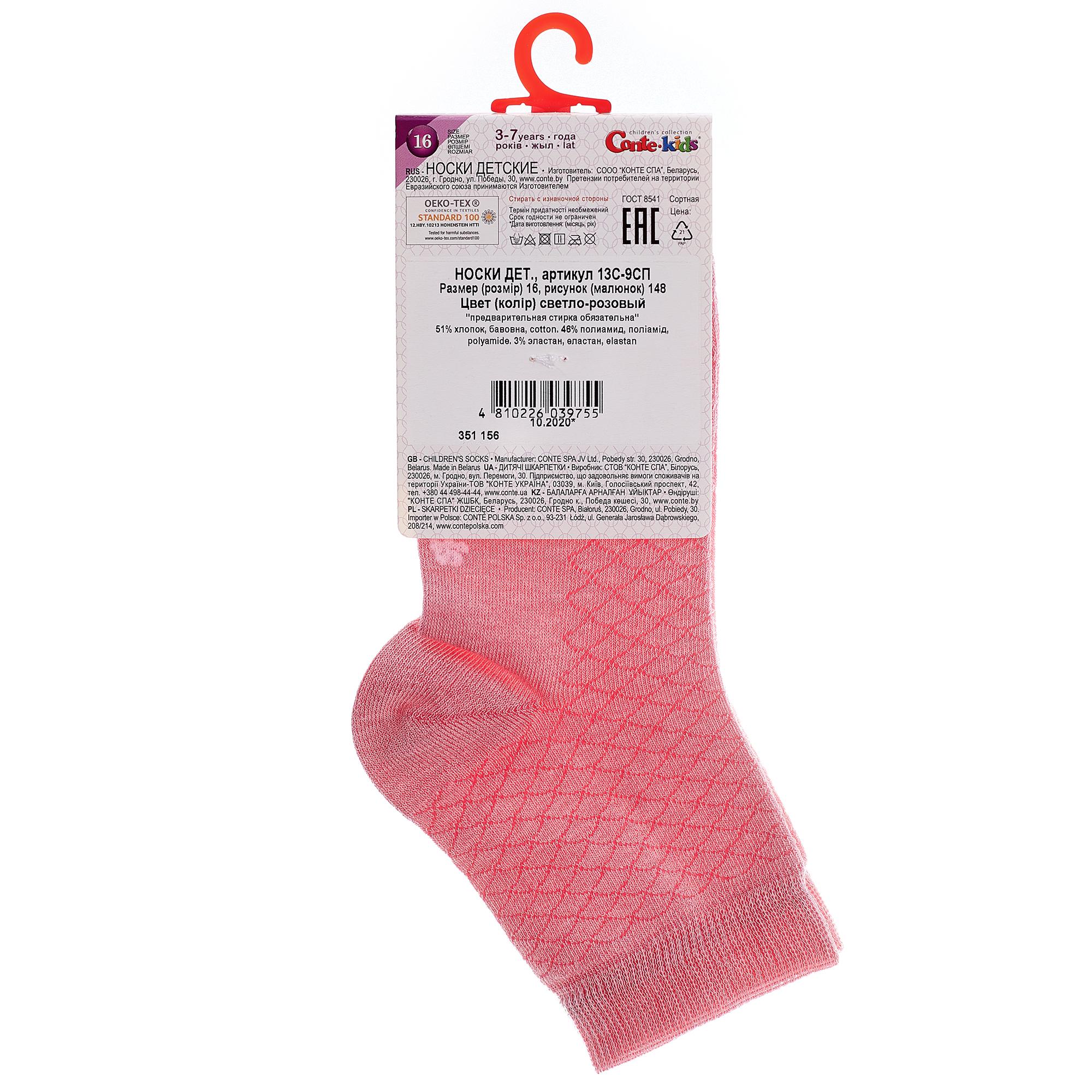 Круглогодичные укороченные детские носки, цвет розовый, классические, состав: 51% хлопок, 46% полиамид, 3% эластан, фабричный артикул 13С-9СП. Производитель «Conte, Беларусь» под брендом «Conte».