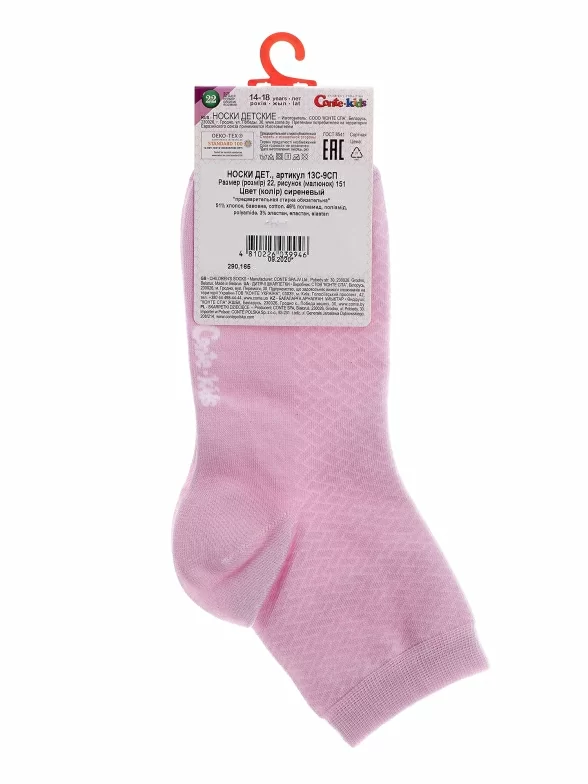 Летние укороченные детские носки, цвет сиреневый, ажурные, состав: 51% хлопок, 46% полиамид, 3% эластан, фабричный артикул 13С-9СП. Производитель «Conte, Беларусь» под брендом «Conte».