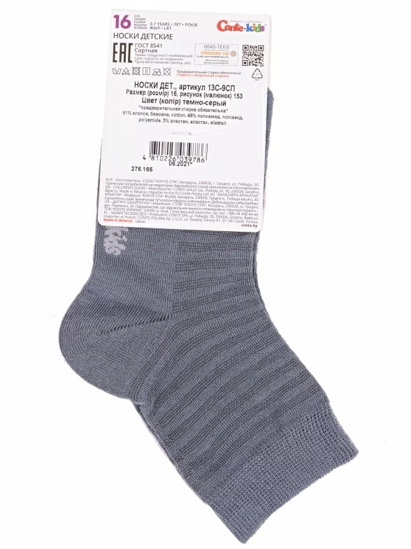 Летние укороченные детские носки, цвет темно-серый, в сеточку, состав: 51% хлопок, 46% полиамид, 3% эластан, фабричный артикул 13С-9СП. Производитель «Conte, Беларусь» под брендом «Conte».
