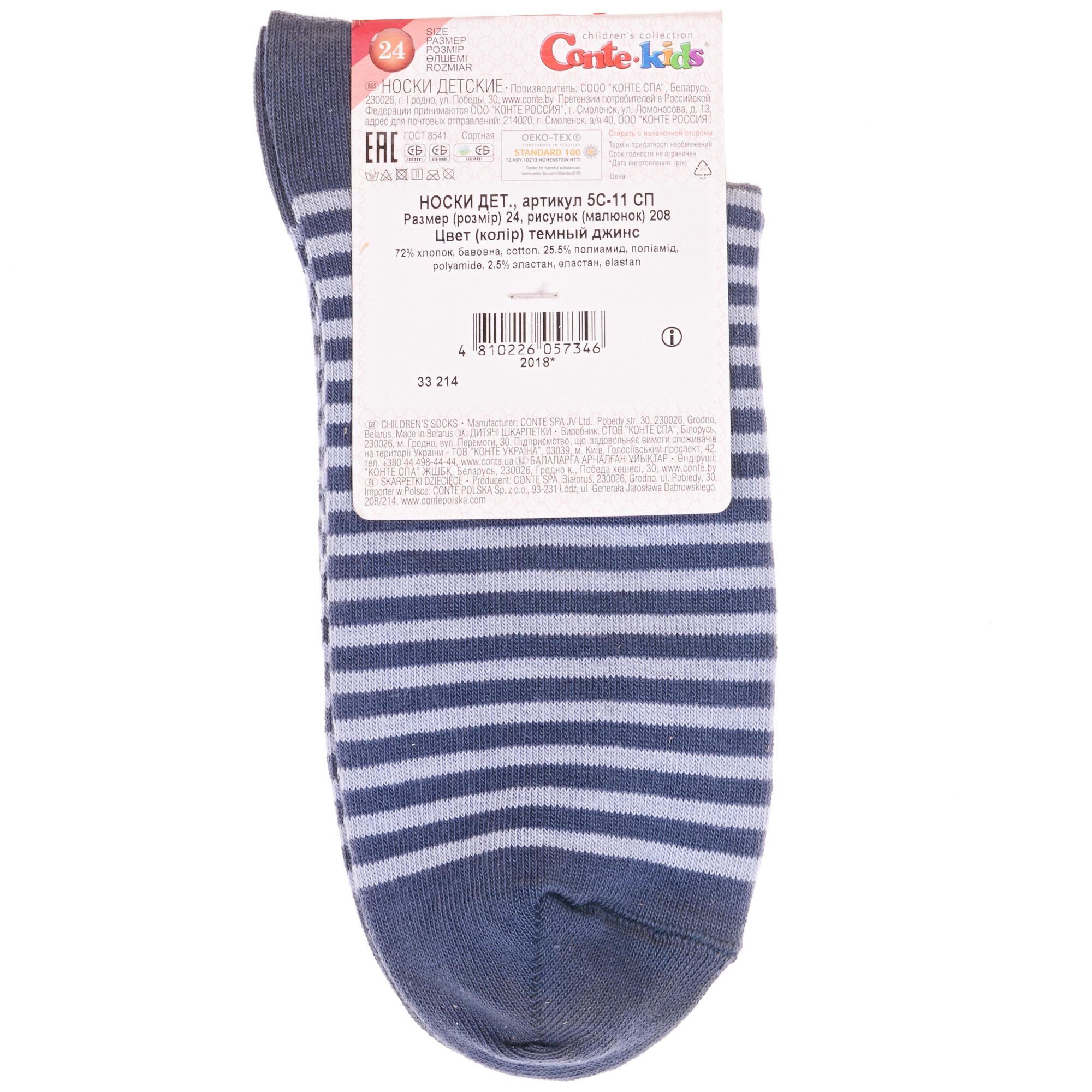 Круглогодичные укороченные детские носки, цвет джинс, прикольные, состав: 72% хлопок, 25,5% полиамид, 2,5% эластан, фабричный артикул 5С-11СП. Производитель «Conte, Беларусь» под брендом «Conte».