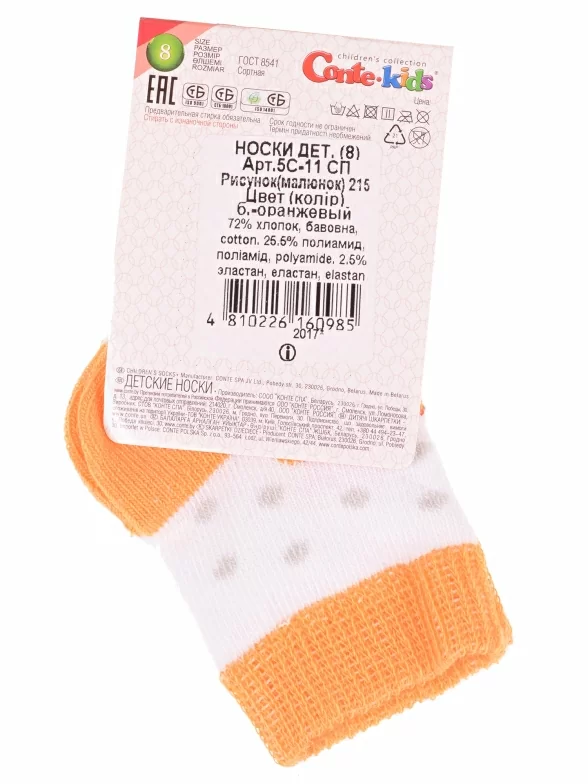 Круглогодичные укороченные детские носки, цвет белый-оранжевый, прикольные, состав: 72% хлопок, 25.5% полиамид, 2.5% эластан, фабричный артикул 5С-11СП. Производитель «Conte, Беларусь» под брендом «Conte».