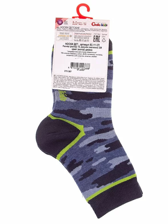 Круглогодичные укороченные детские носки, цвет джинс, прикольные, состав: 72% хлопок, 25,5% полиамид, 2,5% эластан, фабричный артикул 5С-11СП. Производитель «Conte, Беларусь» под брендом «Conte».