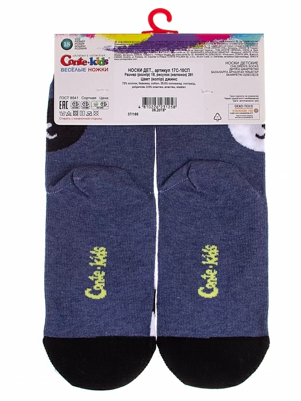 Круглогодичные укороченные детские носки, цвет джинс, прикольные, состав: 72% хлопок, 25.5% полиамид, 2.5% эластан, фабричный артикул 17С-10СП. Производитель «Conte, Беларусь» под брендом «Conte».
