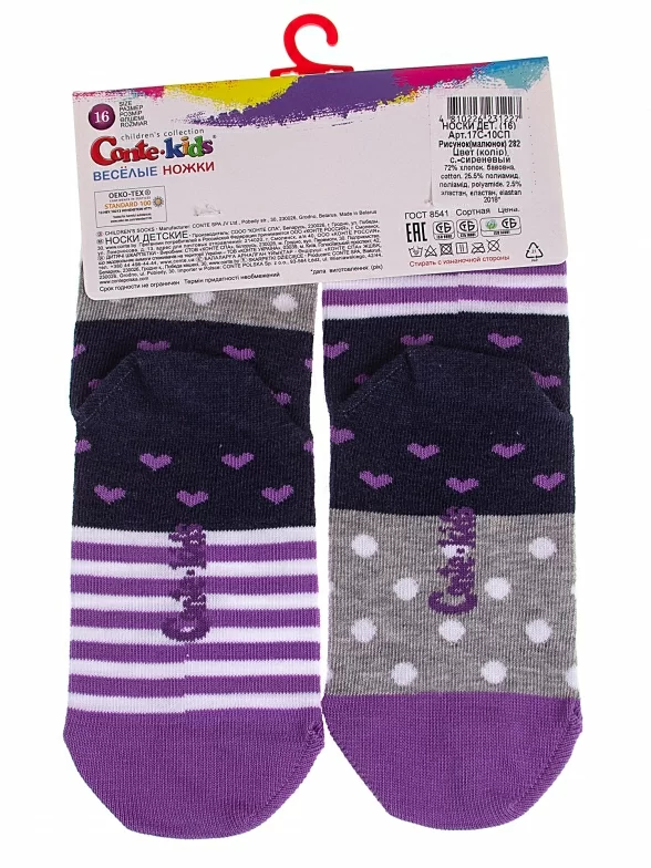 Круглогодичные укороченные детские носки, цвет серый-сиреневый, прикольные, состав: 72% хлопок, 25.5% полиамид, 2.5% эластан, фабричный артикул 17С-10СП. Производитель «Conte, Беларусь» под брендом «Conte».
